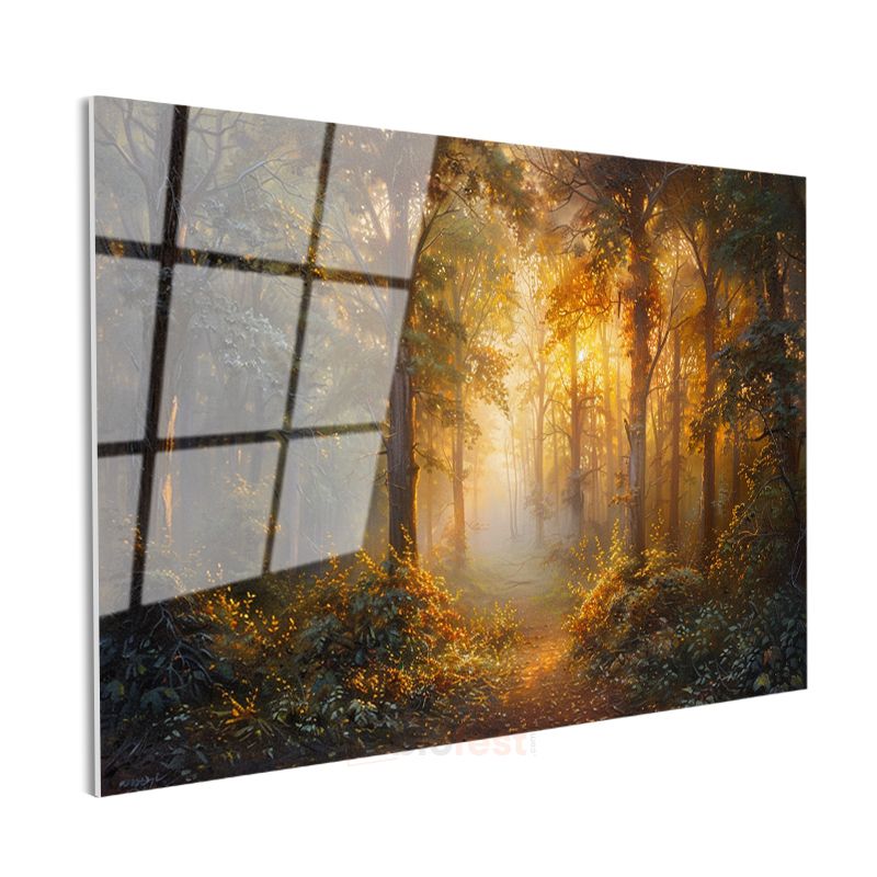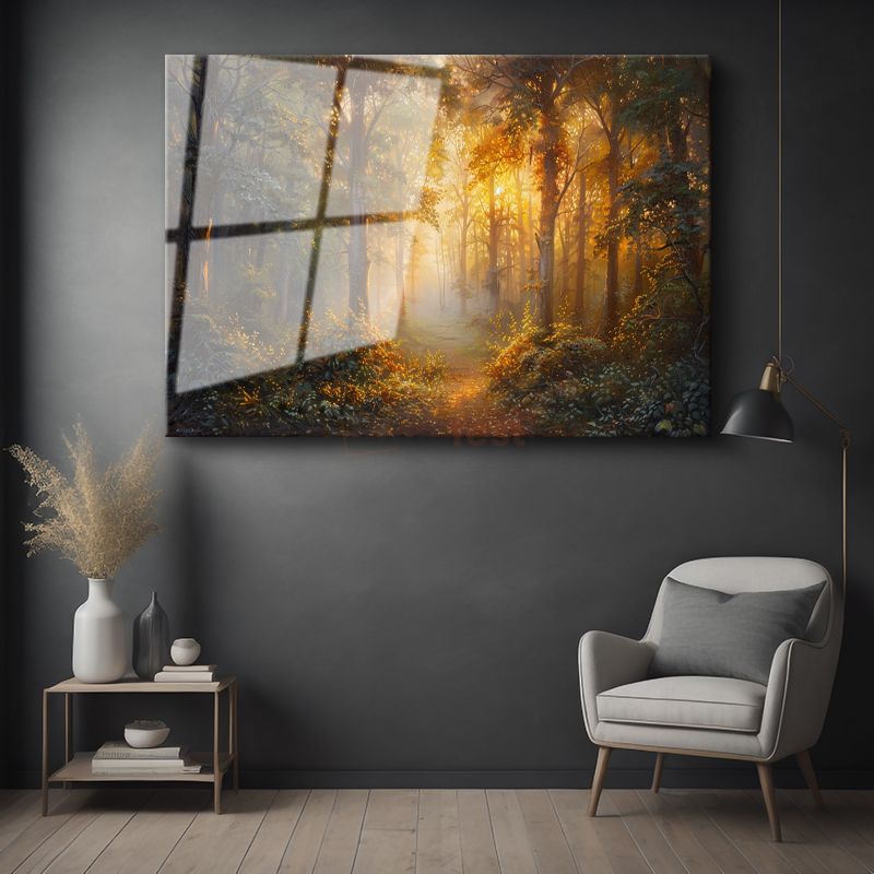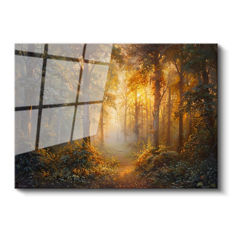 Altın Orman - Gün Işığıyla Aydınlanan Mistik Patika Cam Tablo