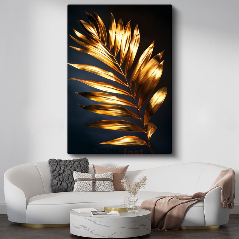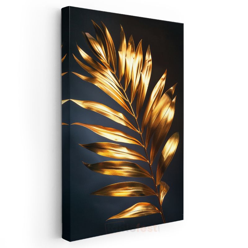 Altın Palmiye - Siyah Fonda Metalik Yaprak Kanvas Tablo