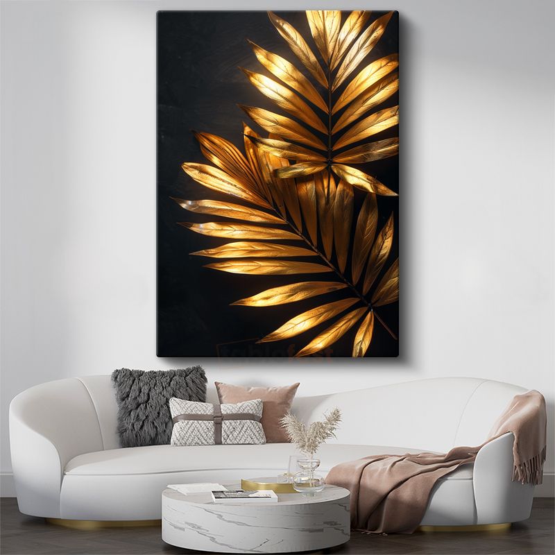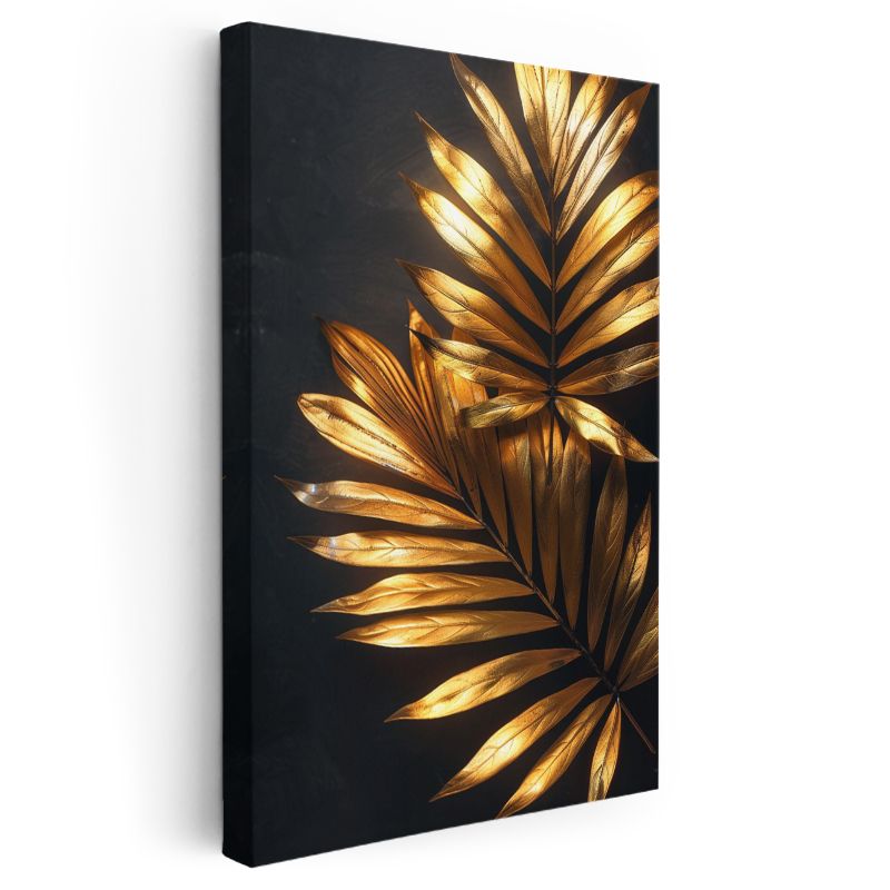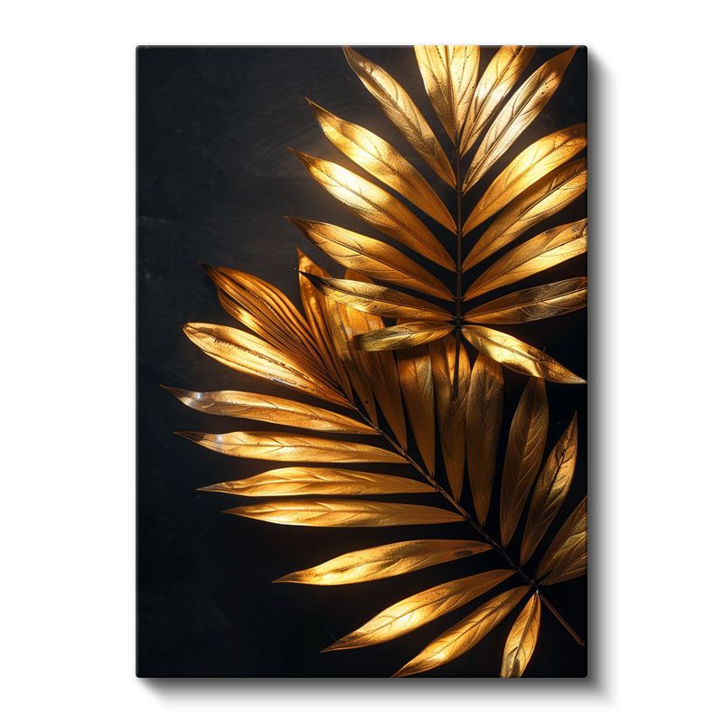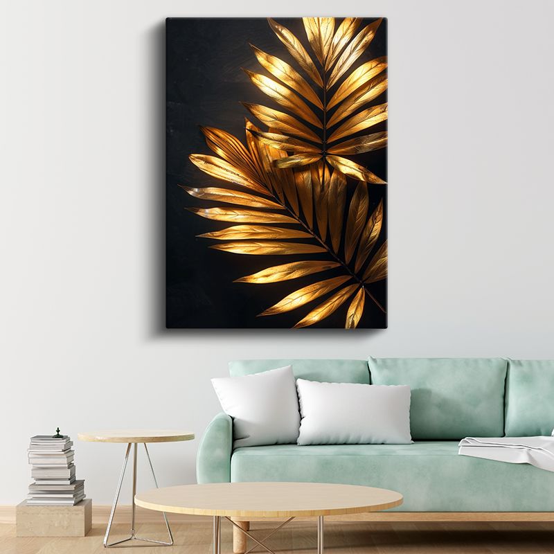 Altın Palmiye - Siyah Zeminde Işıltılı Yapraklar Kanvas Tablo