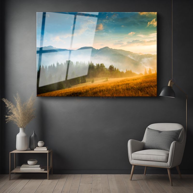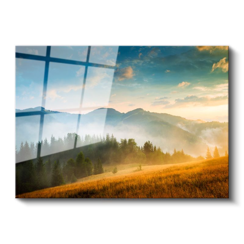 Altın Şafak - Sisli Dağlar ve Çam Ormanları Manzarası Cam Tablo