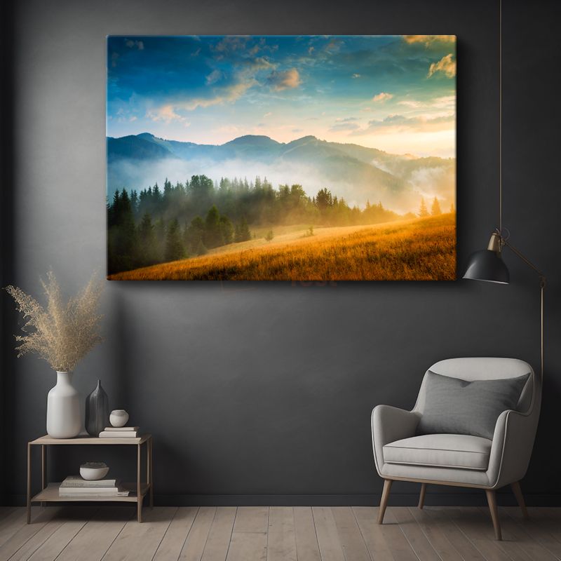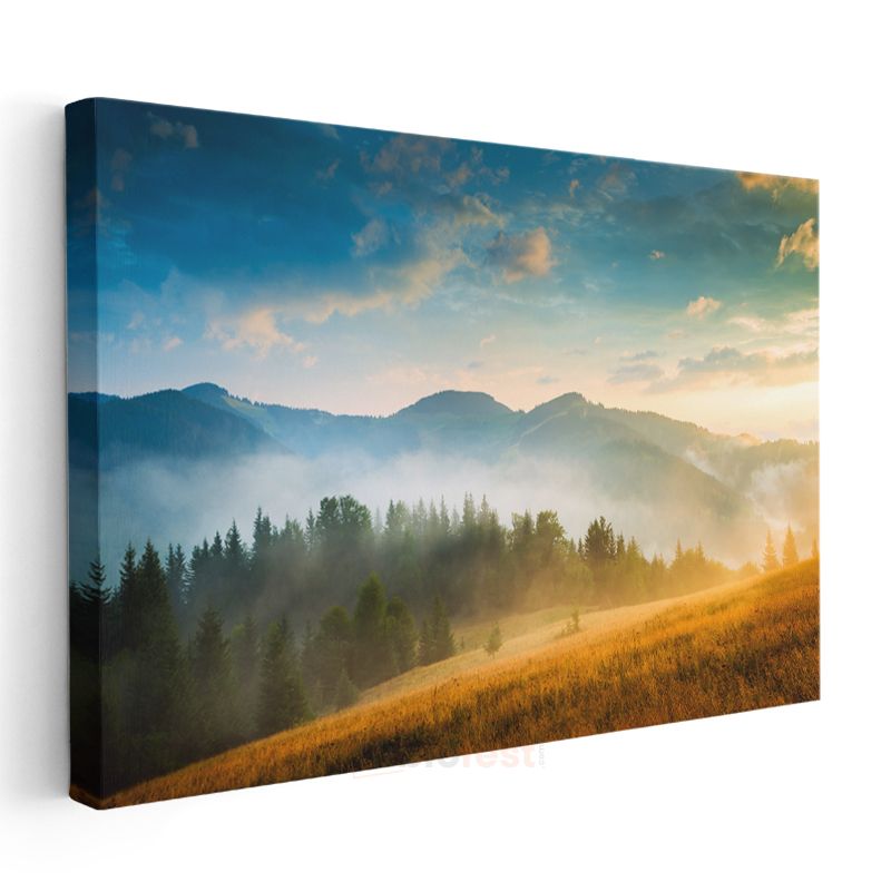 Altın Şafak - Sisli Dağlar ve Çam Ormanları Manzarası Kanvas Tablo