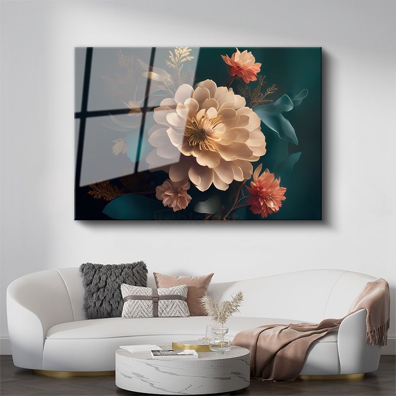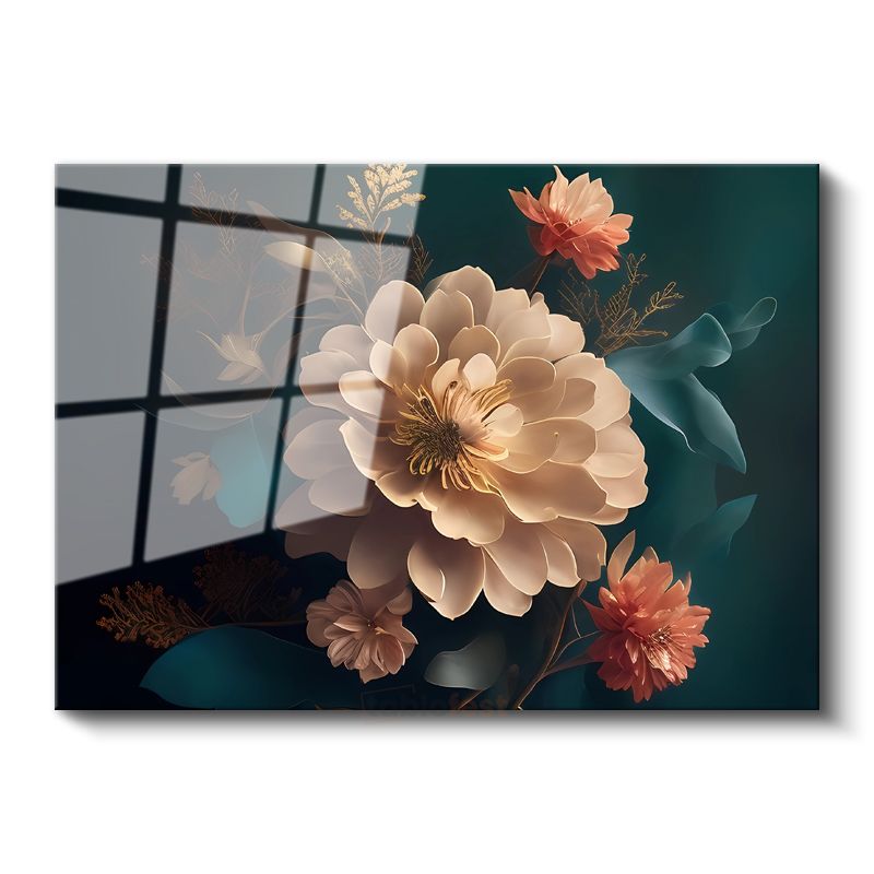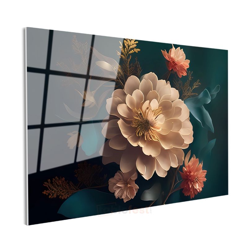 Altın Şakayıklar - Siyah Fonda Metalik Çiçek Kompozisyonu Cam Tablo