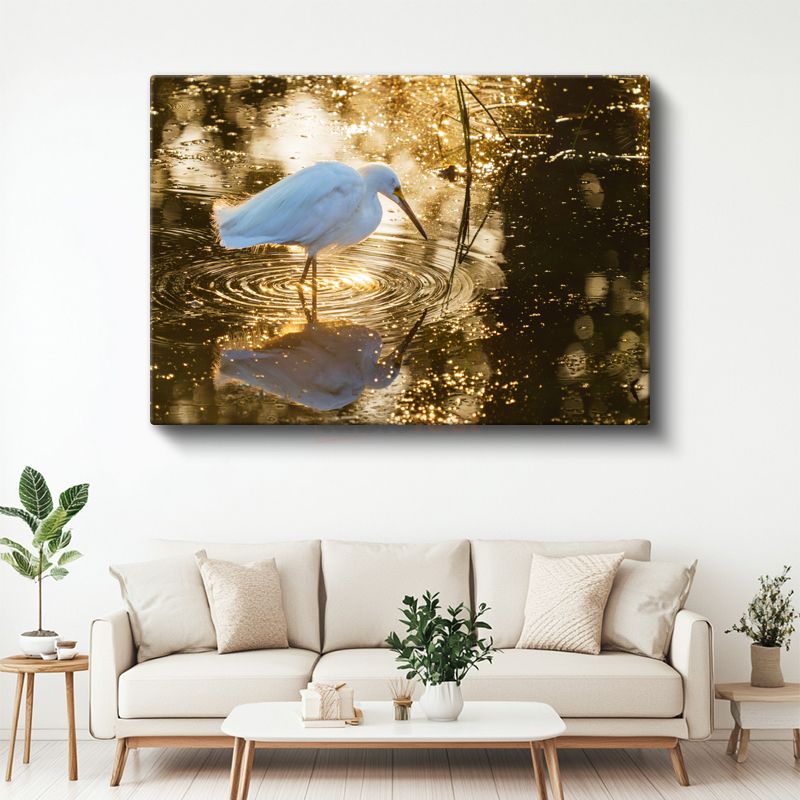 Altın Suda Balıkçıl - Işıltılı Yansıma Kanvas Tablo