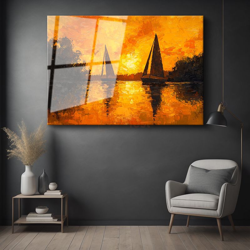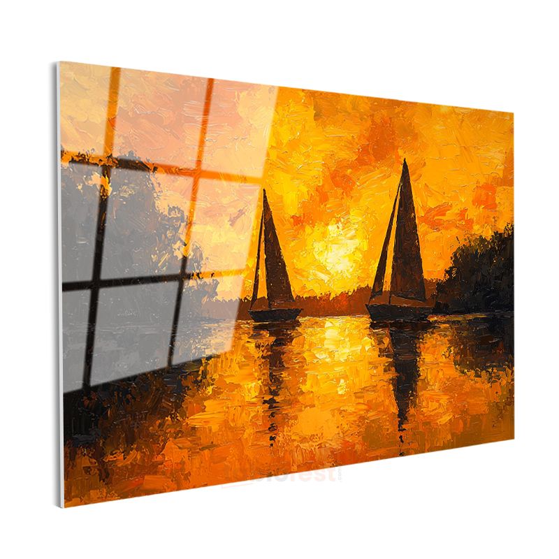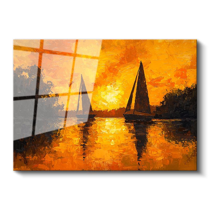Altın Sular - Gün Batımında Yelkenlilerin Dansı Cam Tablo
