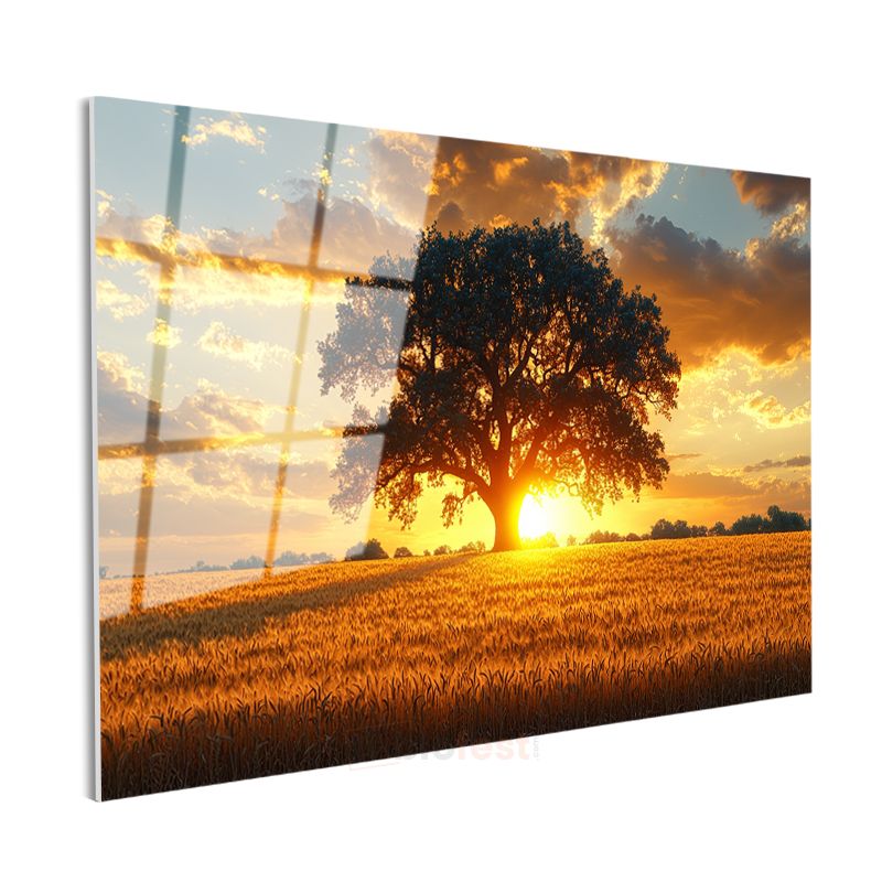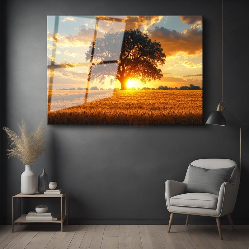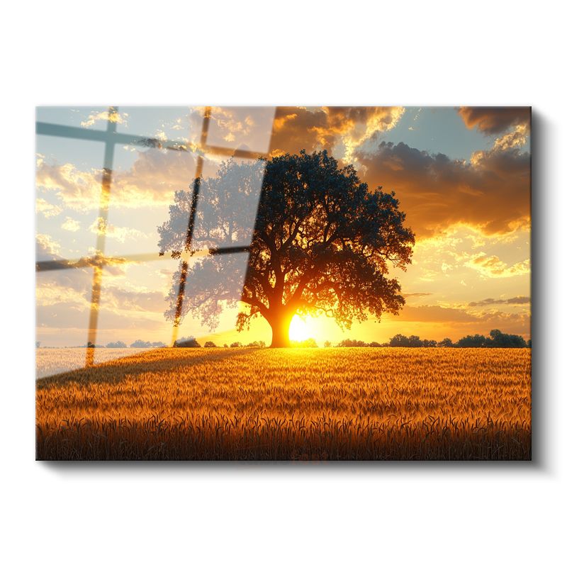 Altın Tarla - Gün Batımında Tek Ağaç Silüeti Cam Tablo