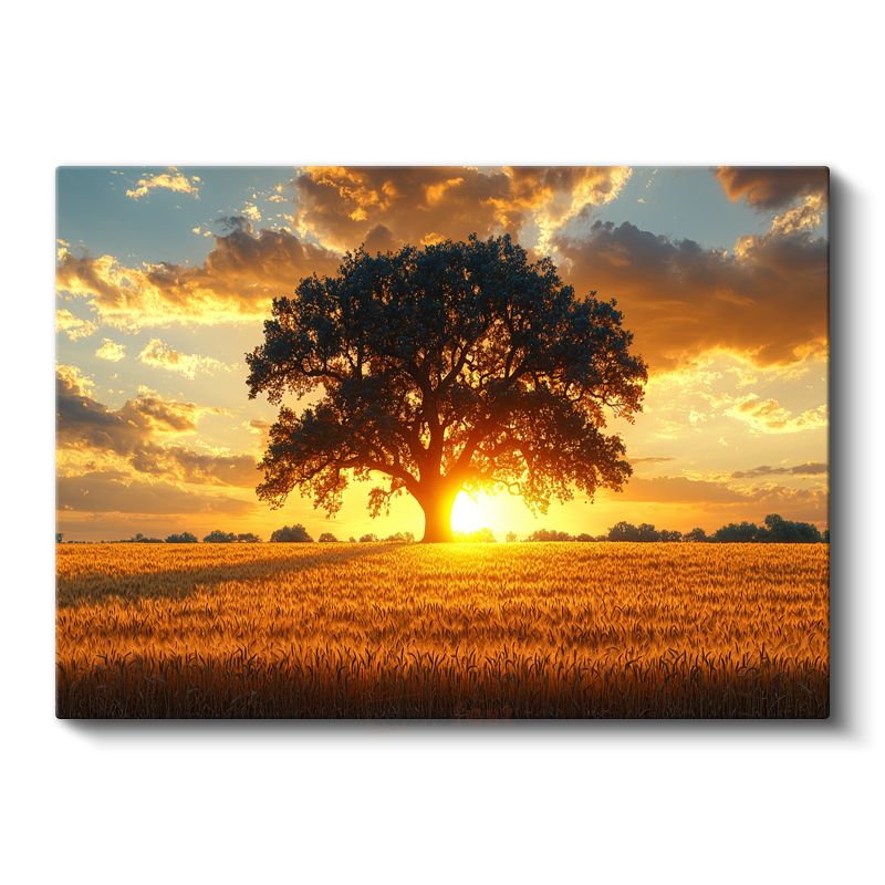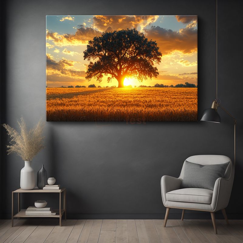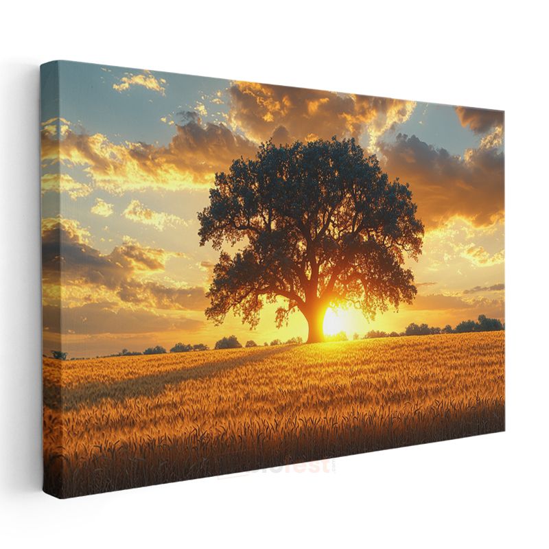 Altın Tarla - Gün Batımında Tek Ağaç Silüeti Kanvas Tablo
