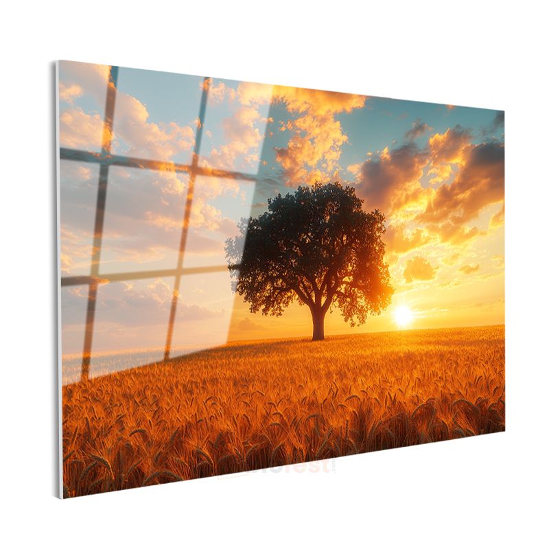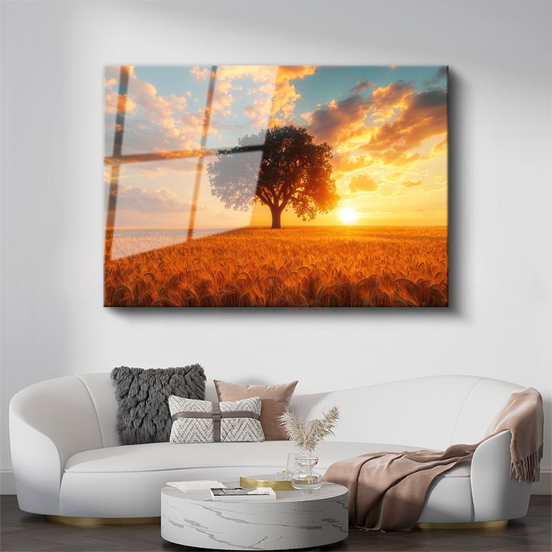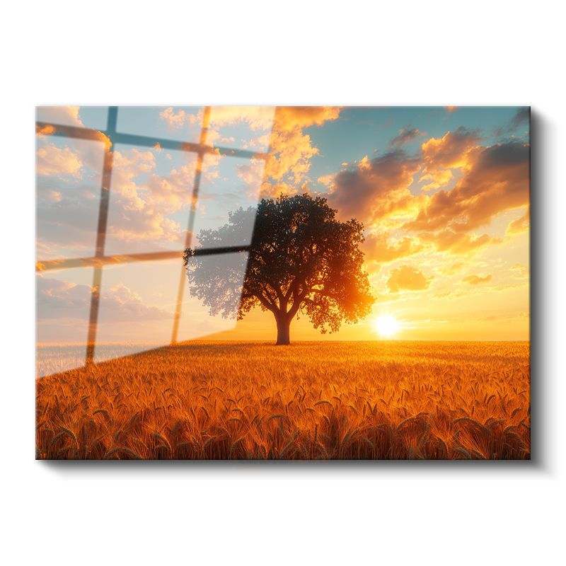 Altın Tarla - Gün Batımında Yalnız Ağaç Silueti Cam Tablo