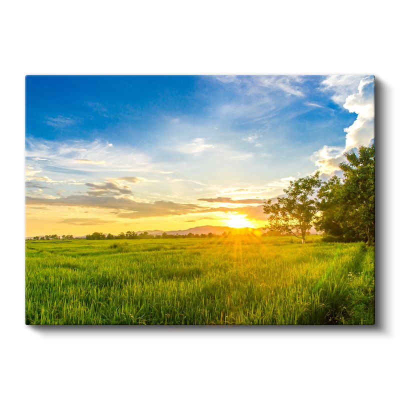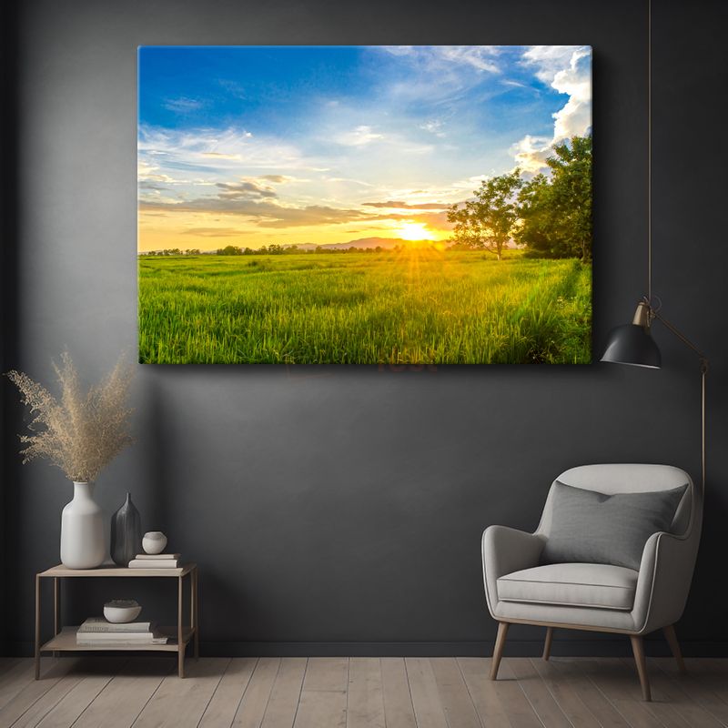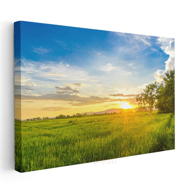 Altın Tarlalar - Gün Batımında Parlayan Yeşil Çayır Kanvas Tablo