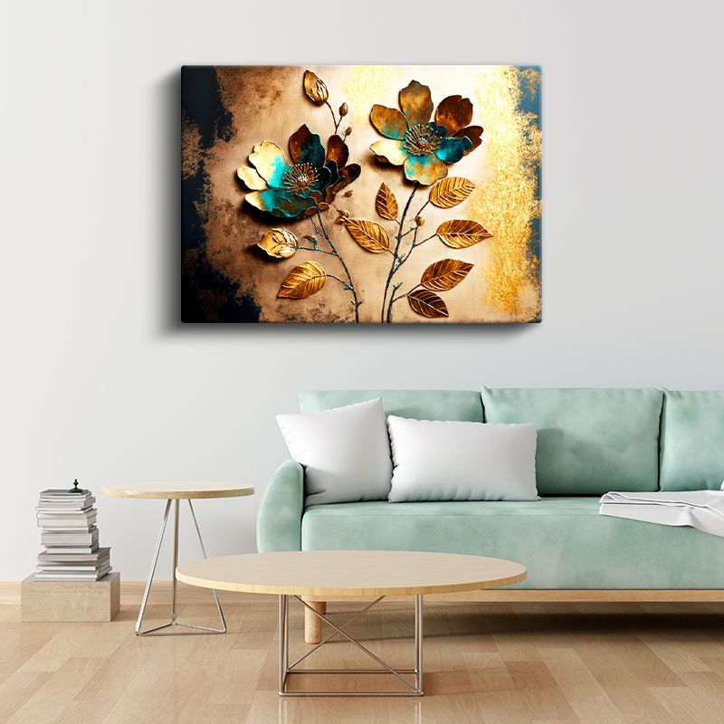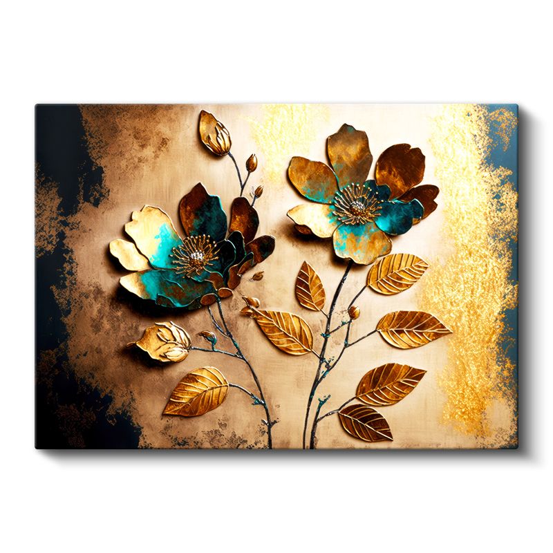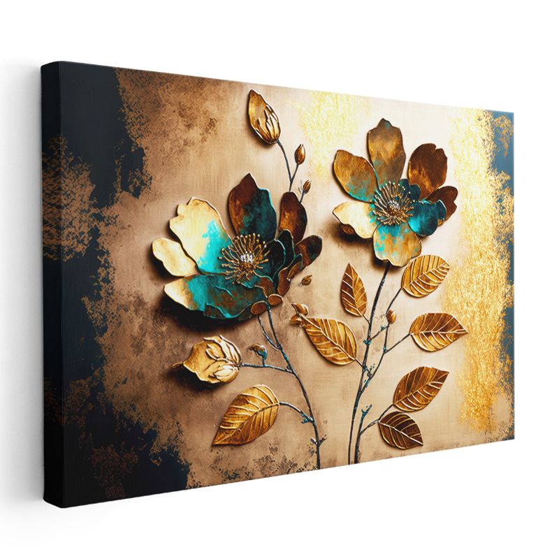 Altın Turkuaz Çiçekler - 3D Kabartma Görünümlü Metalik Yaprak Sanatı Kanvas Tablo