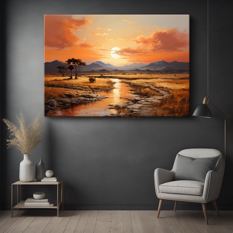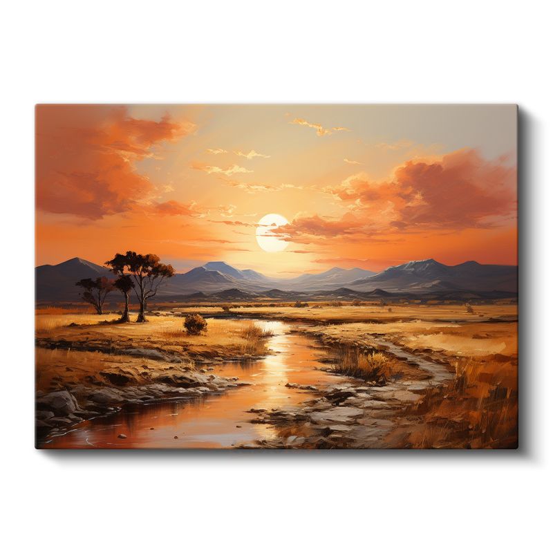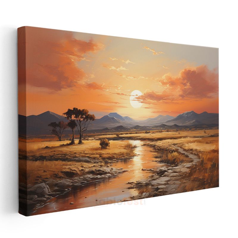 Altın Vadi - Gün Batımında Dağlar ve Akarsu Manzarası Kanvas Tablo