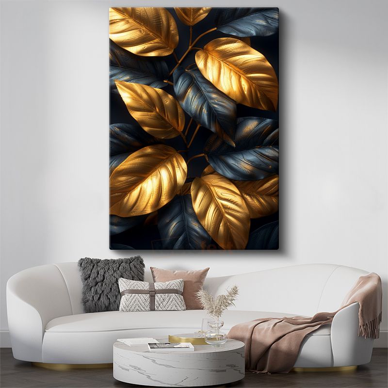 Altın ve Lacivert Yapraklar - Lüks Metalik Botanik Kanvas Tablo