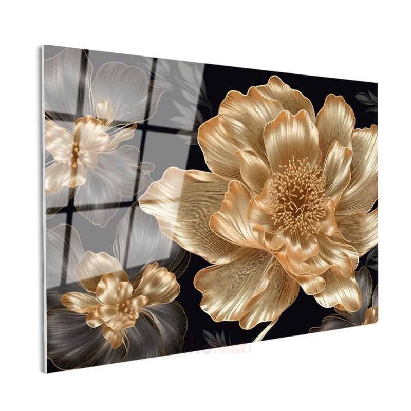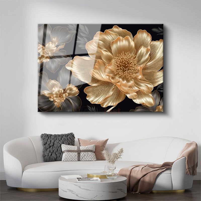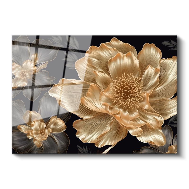 Altın Yapraklar - Krem Fonda Mavi Çiçek Kompozisyonu Cam Tablo