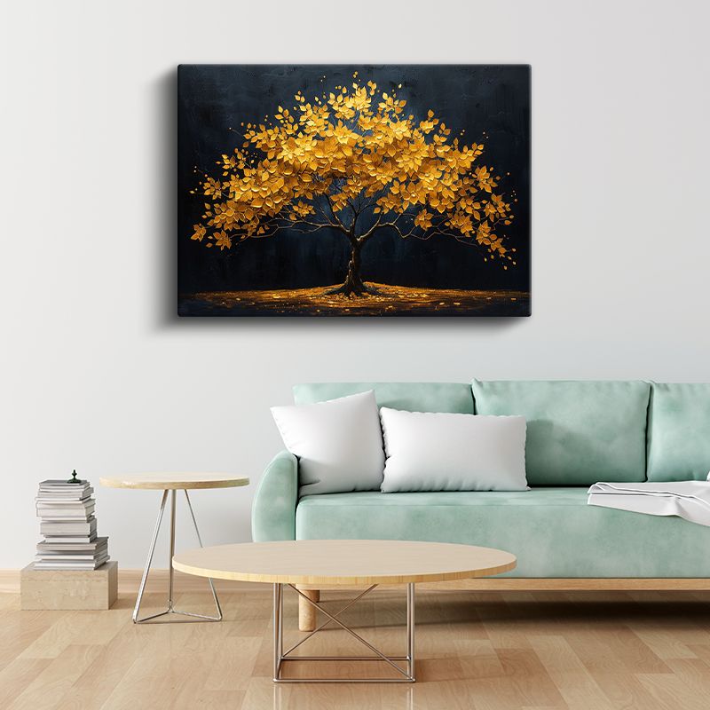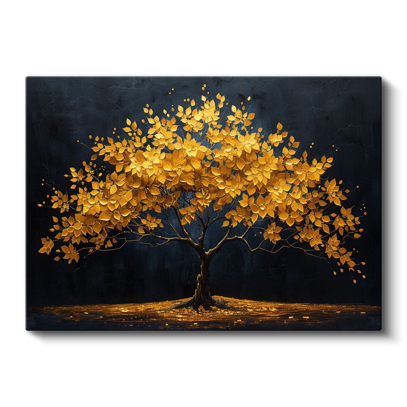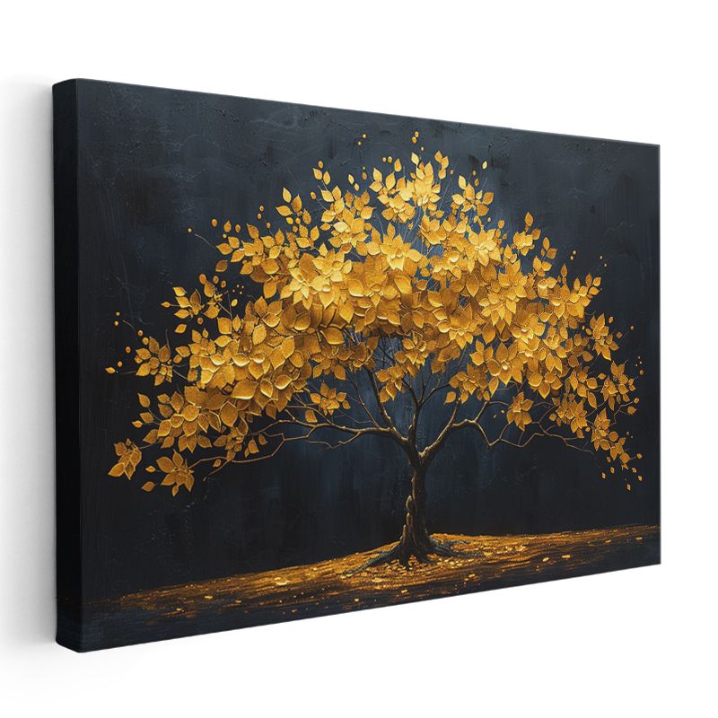 Altın Yapraklı Ağaç - Siyah Fonda Işıltılı Dekoratif Kanvas Tablo