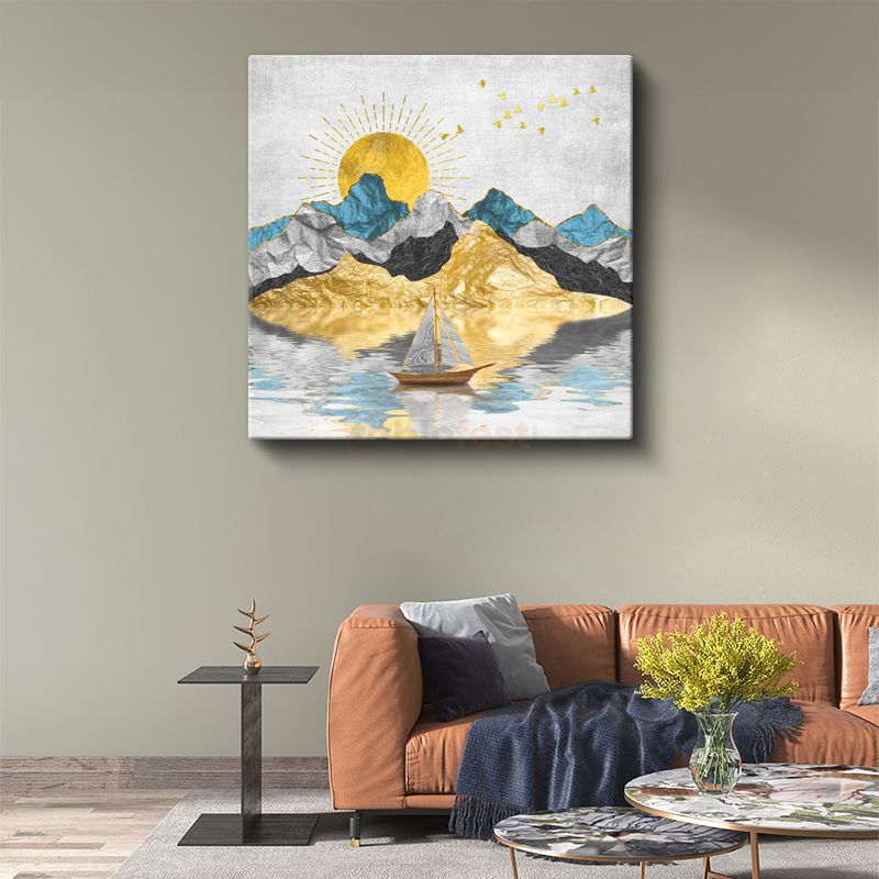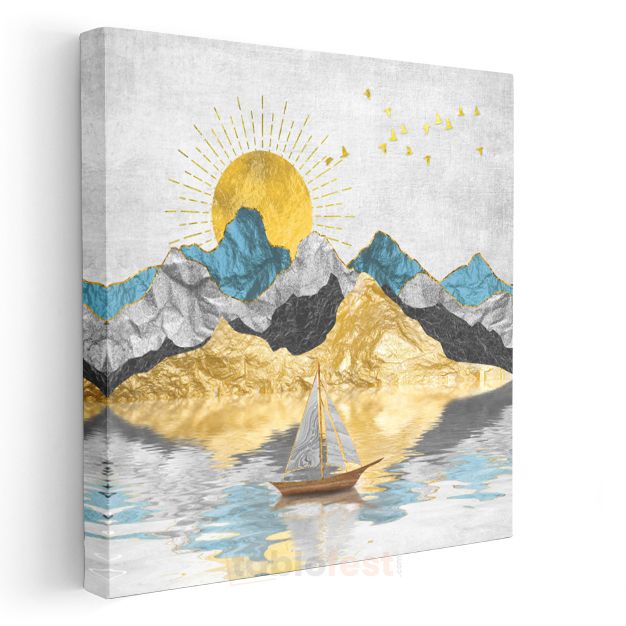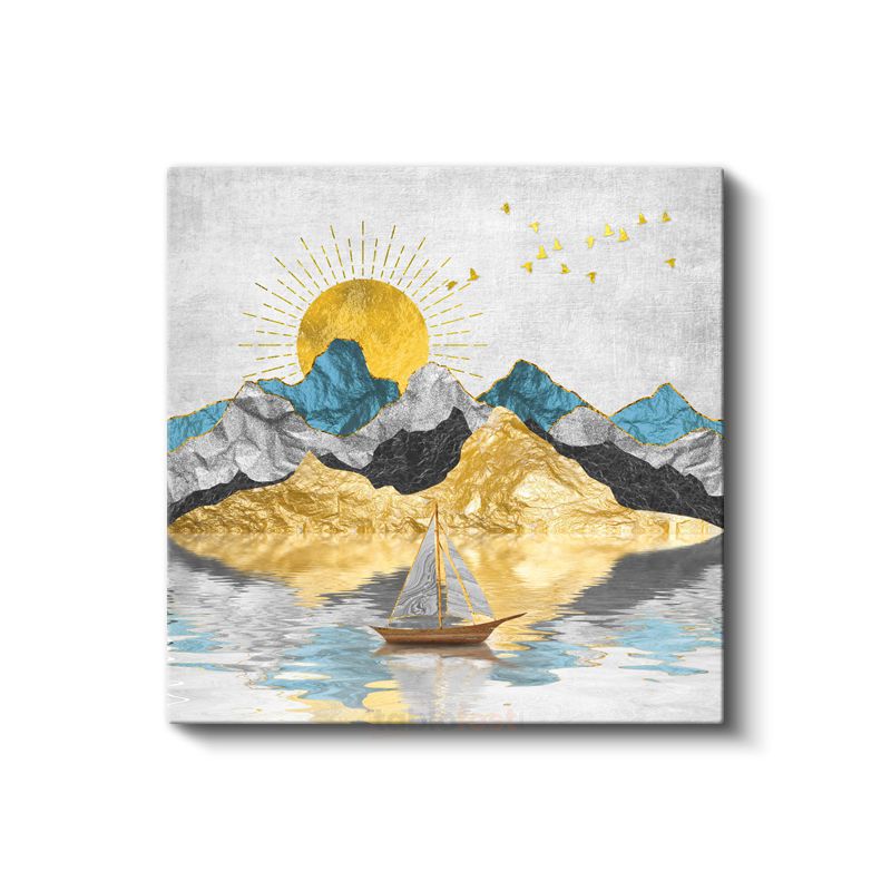 Altın Yolculuk - Mavi Dağlar ve Yelkenli Soyut Manzara Kanvas Tablo