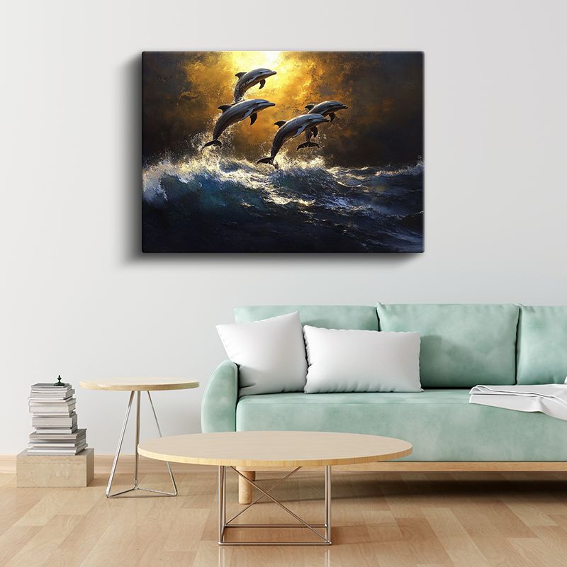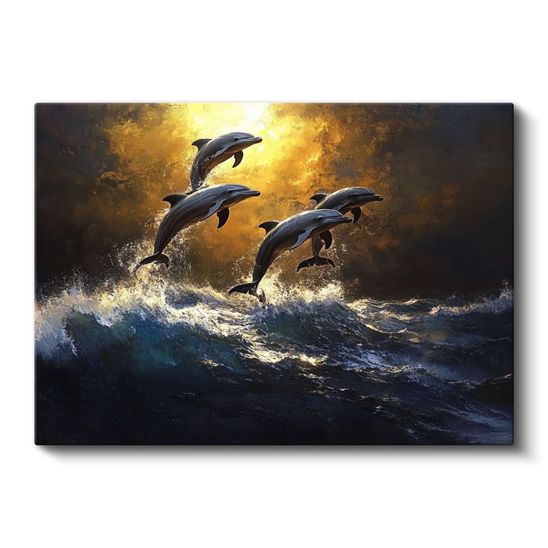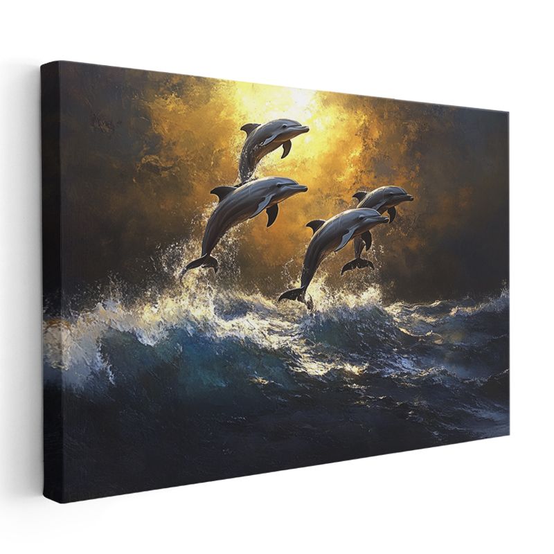 Altın Yunuslar - Dalgalarda Sıçrayan Dörtlü Kanvas Tablo