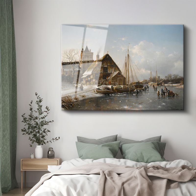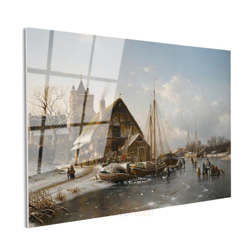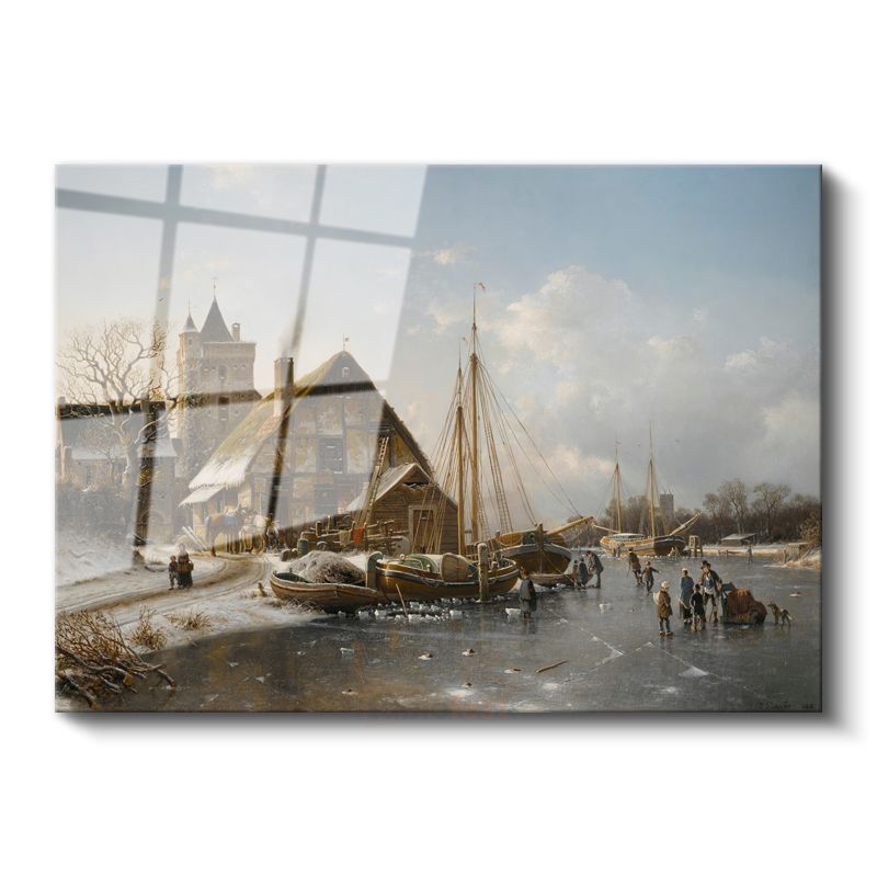 Andreas Schelfhout - Kış Manzarasında Tekneler Cam Tablo