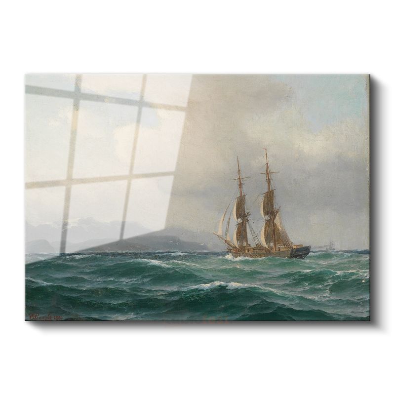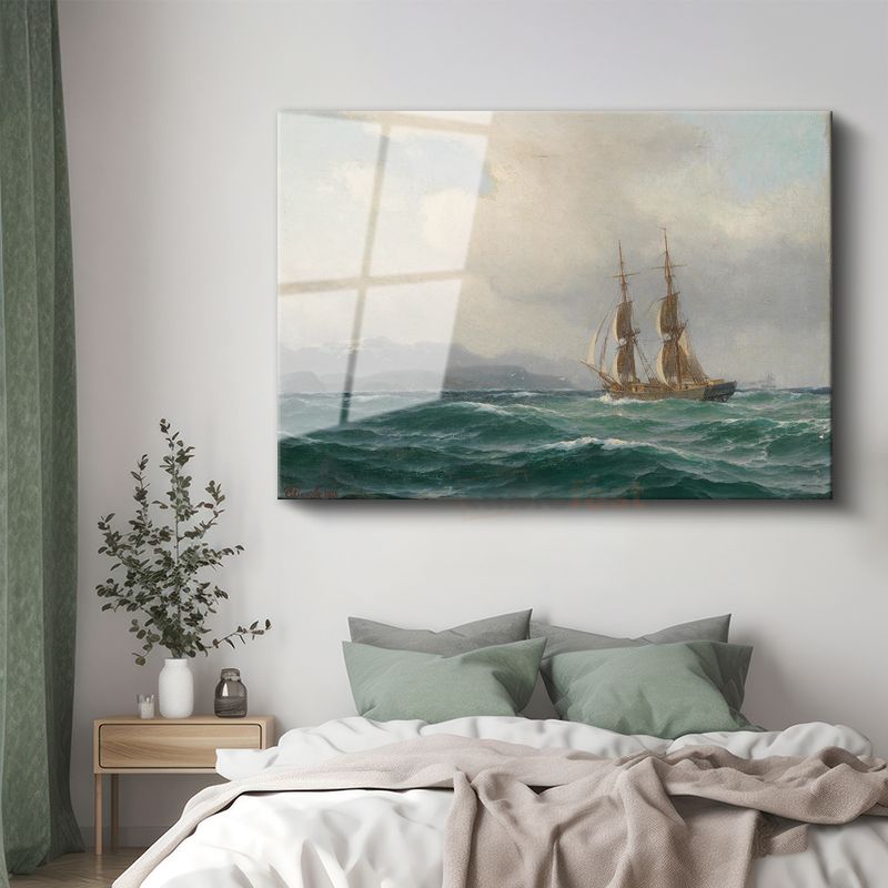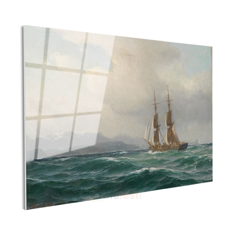 Anton Melbye - Dalgalı Denizde Yelkenli Cam Tablo