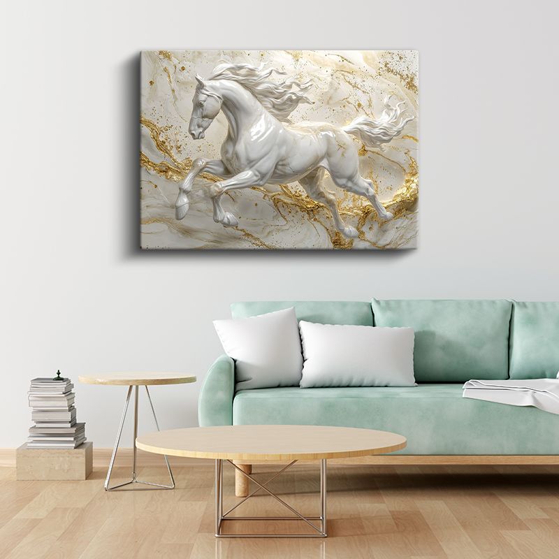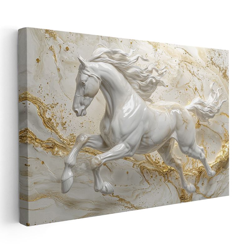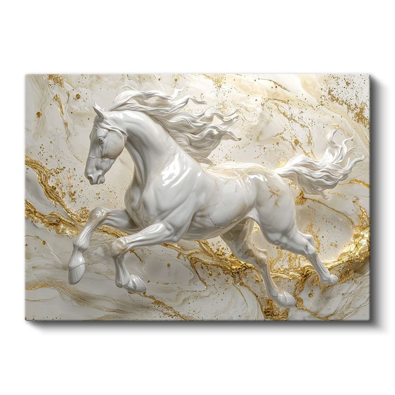 Asil Beyaz At - Altın Detaylı Mermer Efektli Kanvas Tablo