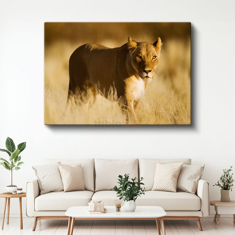 Aslan Kraliçesi - Altın Sarısı Savanada Heybetli Duruş Kanvas Tablo