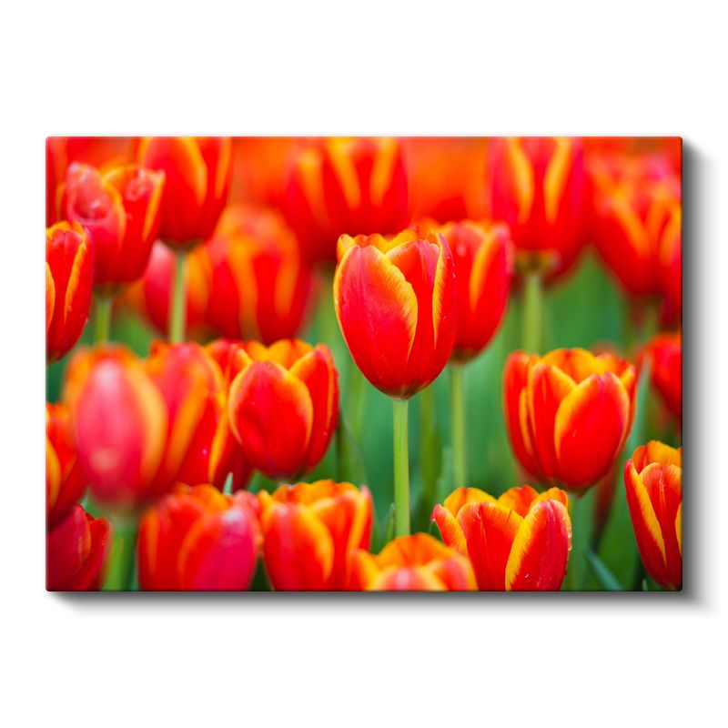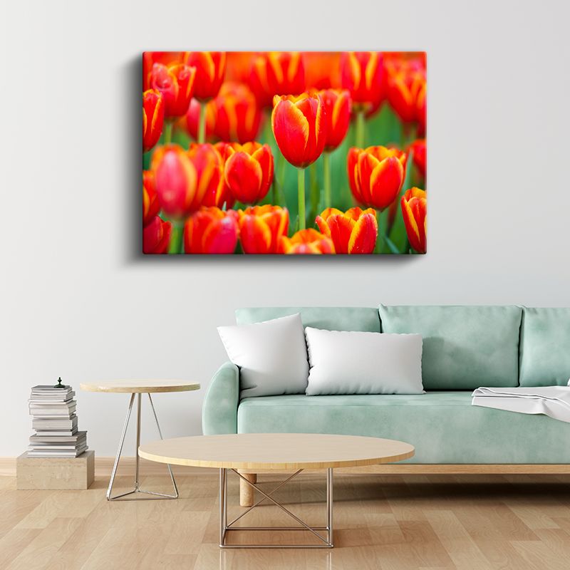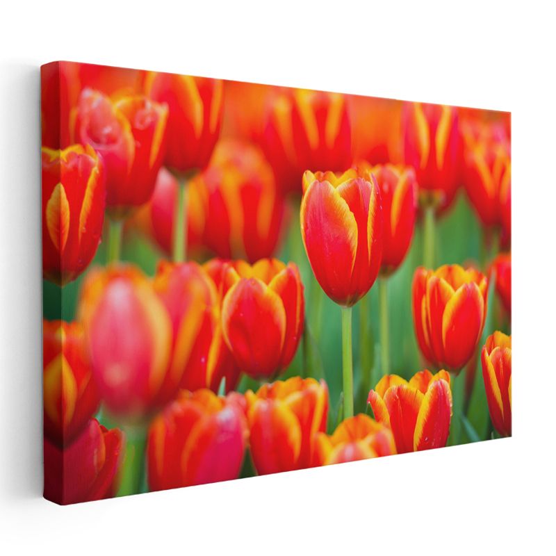 Ateş Laleler - Yeşil Fonda Turuncu Kırmızı Çiçek Bahçesi Kanvas Tablo
