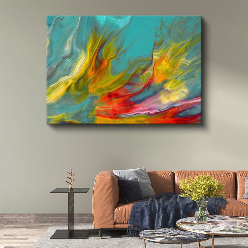 Ateş Ruhu - Turkuaz Üzerinde Canlı Renkli Akışkan Sanat Kanvas Tablo