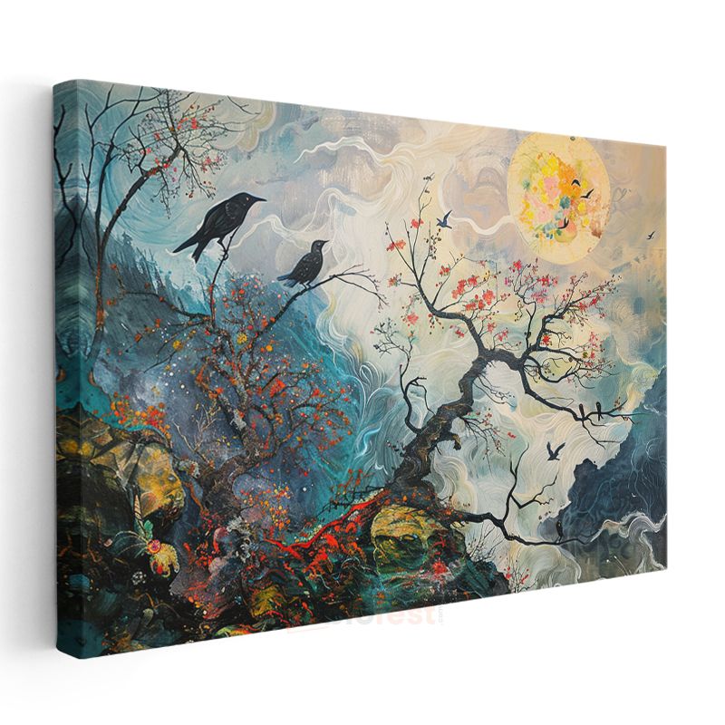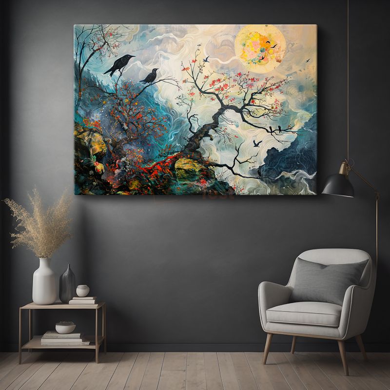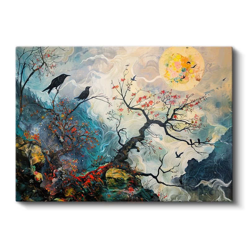 Ay Işığı Altında - Kargalar ve Çiçekli Ağaç Silüeti Kanvas Tablo