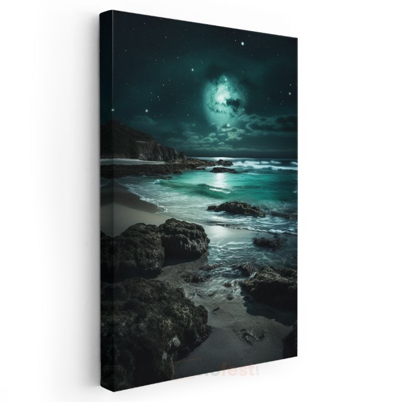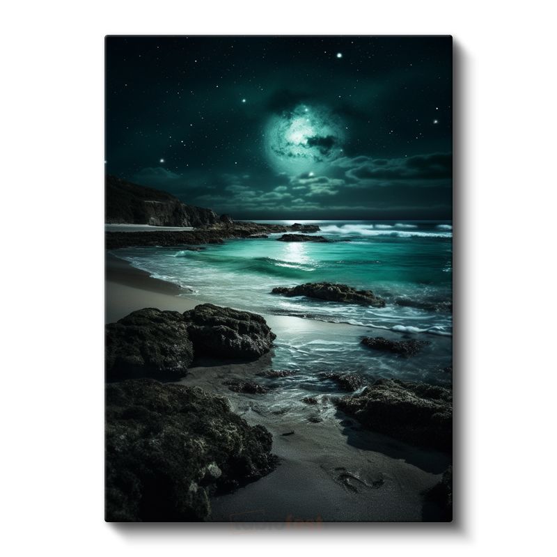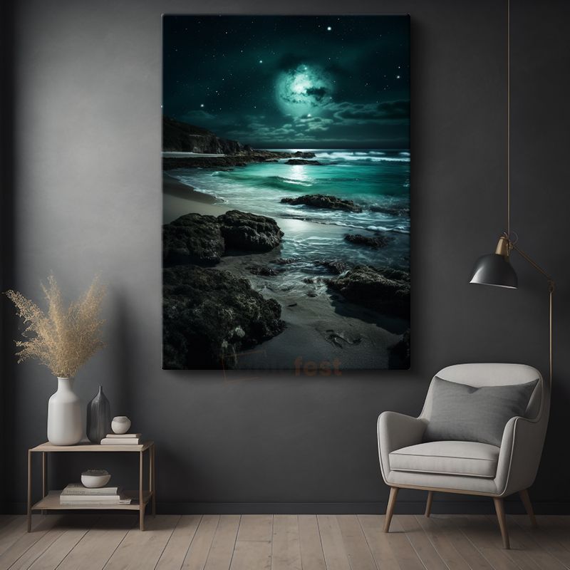 Ay Işığı Sahili - Turkuaz Dalgaların Kayalıklara Vuruşu Kanvas Tablo