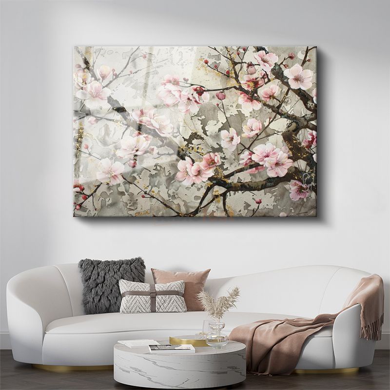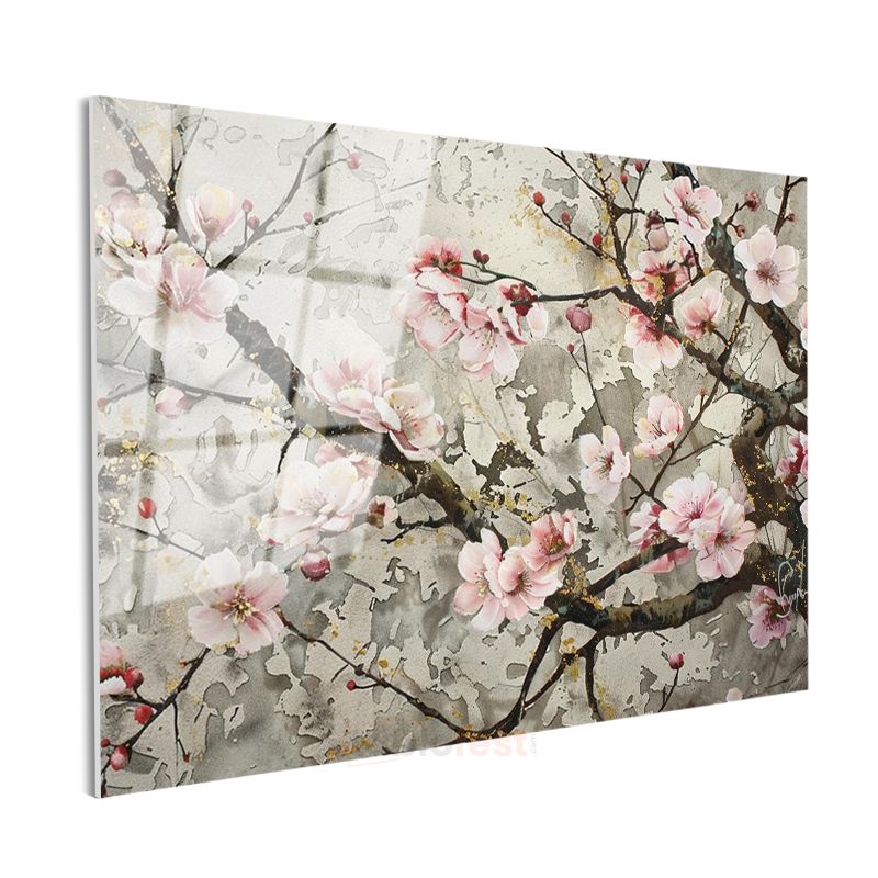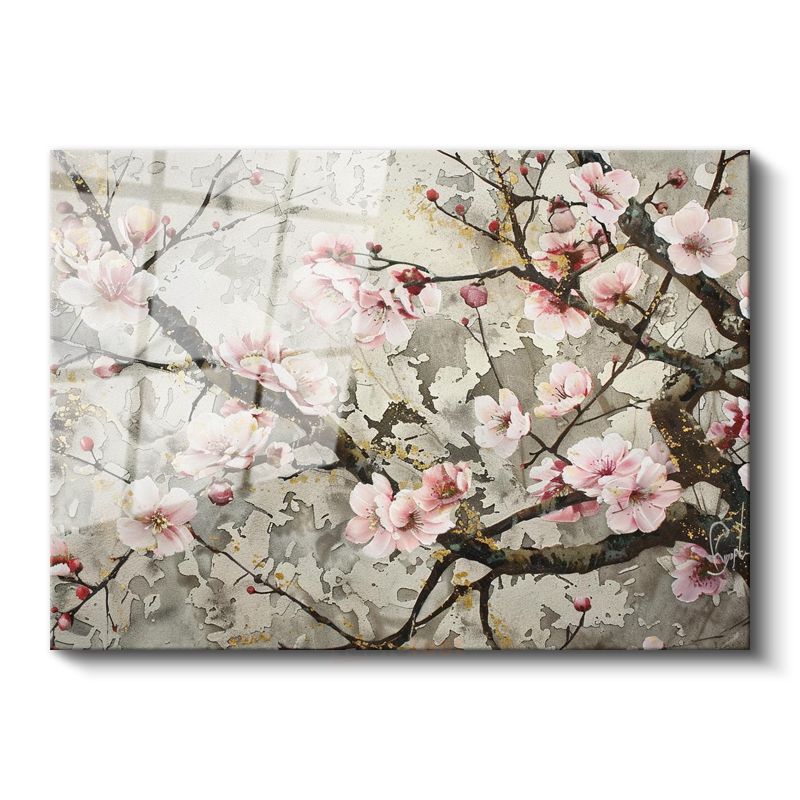 Ay Işığında Çiçekler - Altın Detaylı Gece Bahçesi Cam Tablo