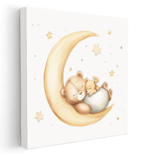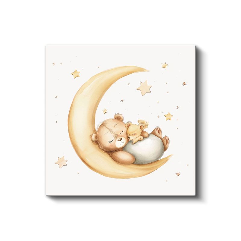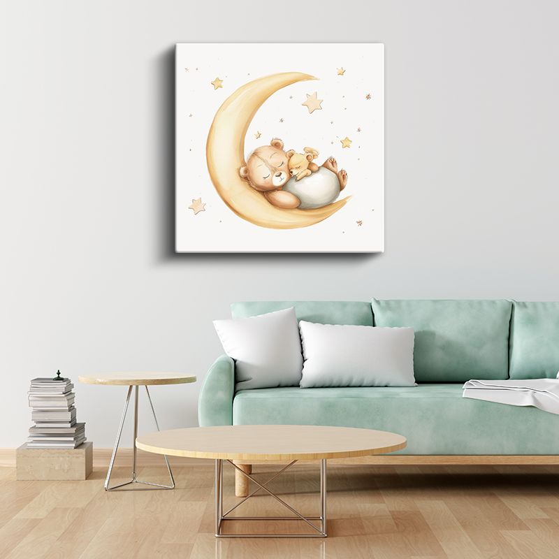 Ay Üzerinde Uyuyan Ayıcık - Yıldızlı Gece Masalı Kanvas Tablo