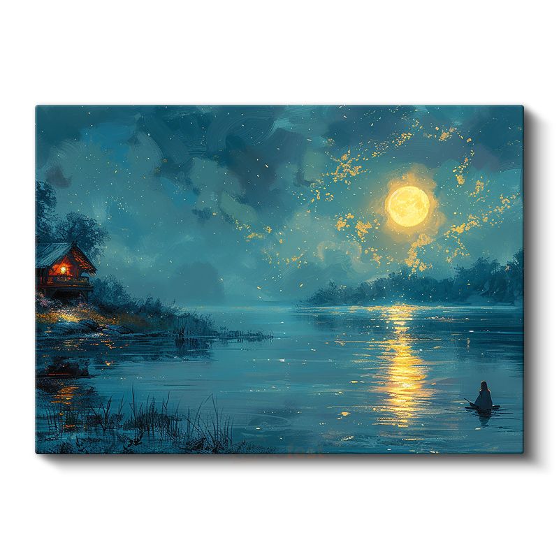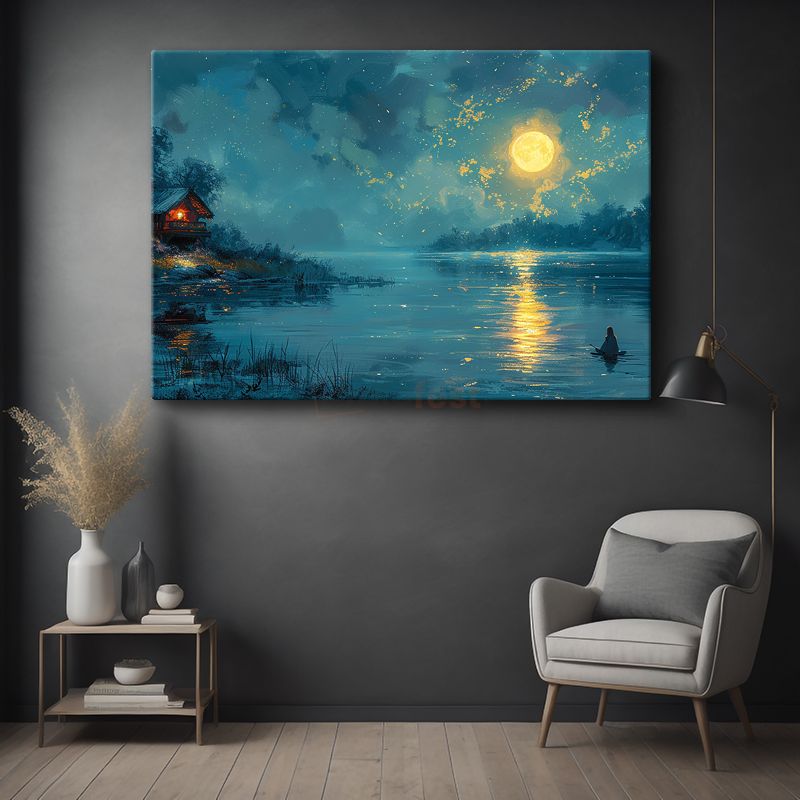Ay Yansıması - Göl Kenarında Huzurlu Gece Manzarası Kanvas Tablo