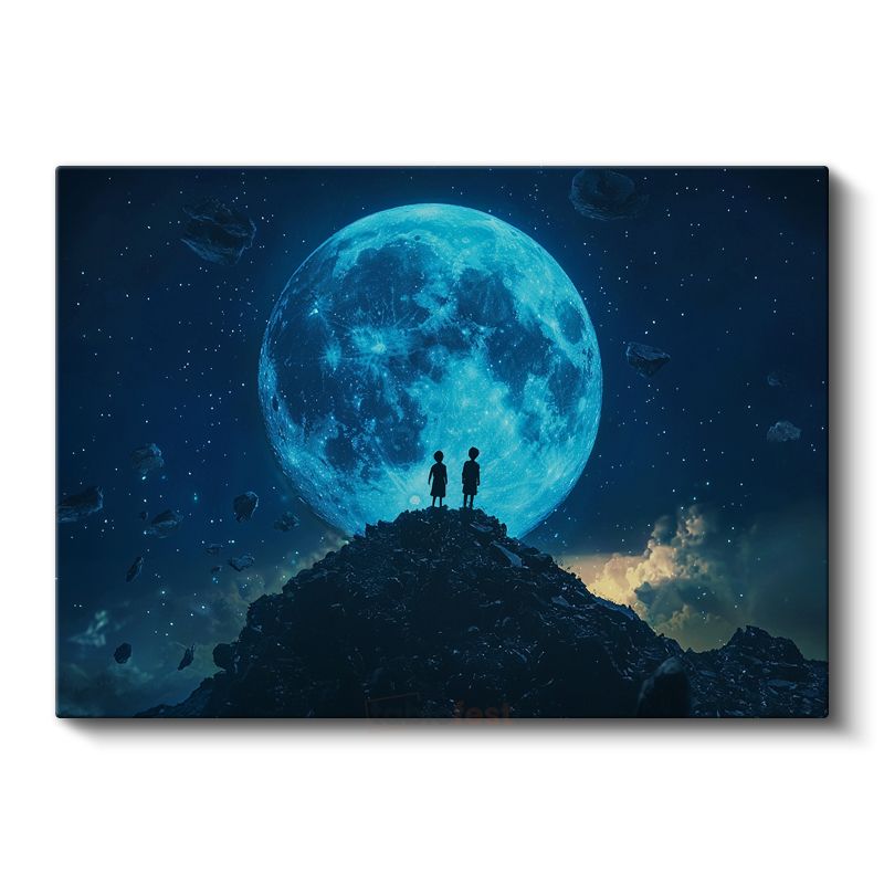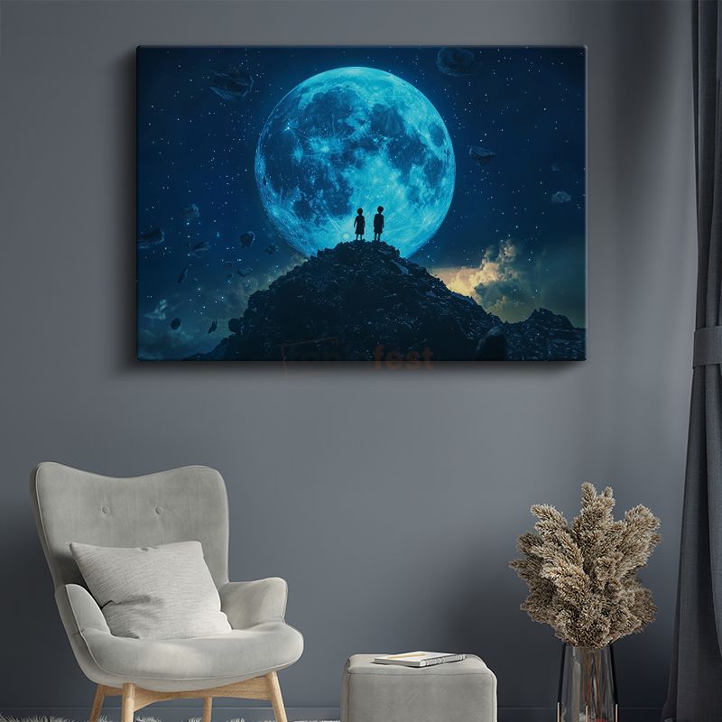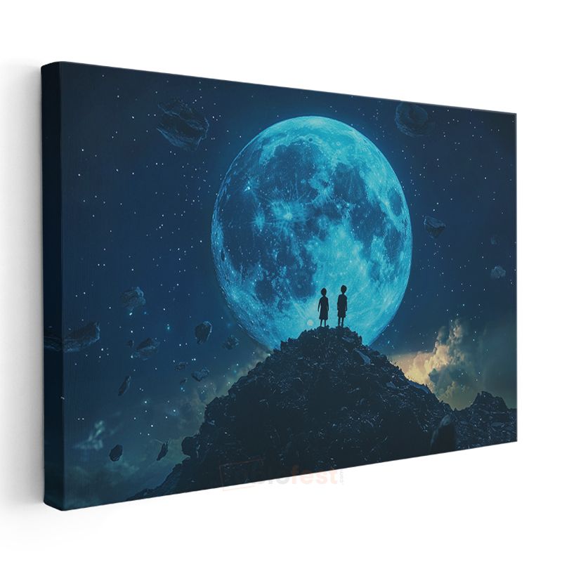 Ay'ın Bekçileri - Devasa Mavi Dolunay Karşısında İki Silüet Kanvas Tablo