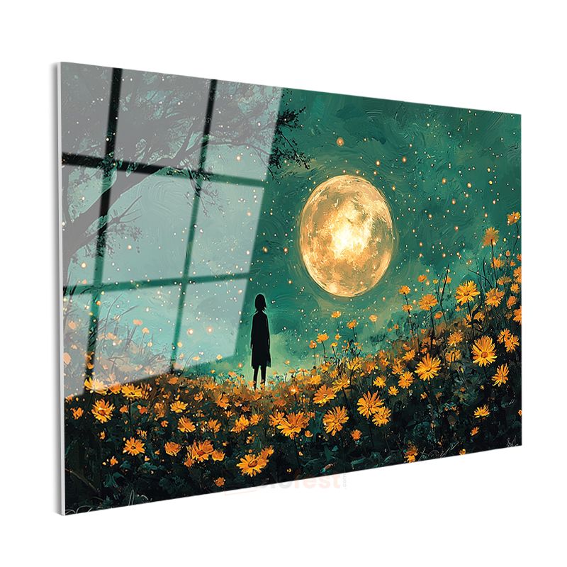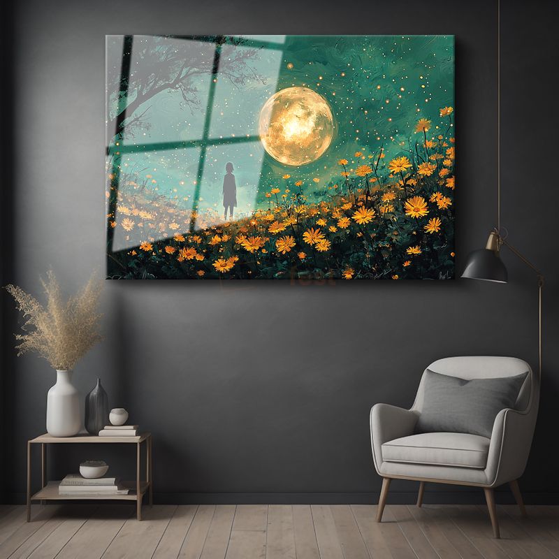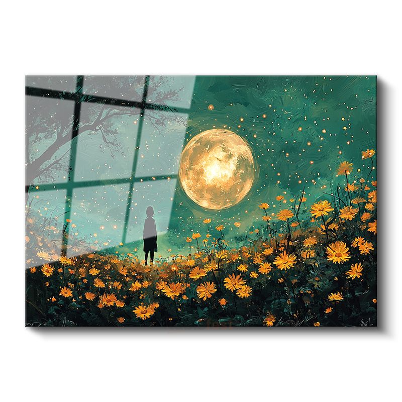 Ayışığı - Sarı Çiçekler Arasında Büyülü Gece Cam Tablo