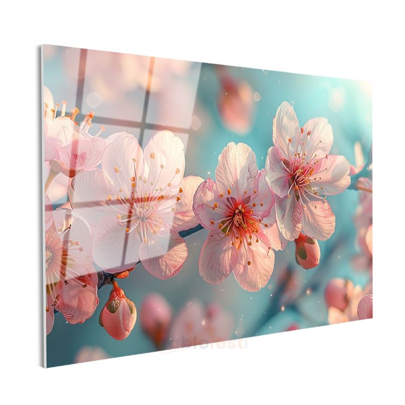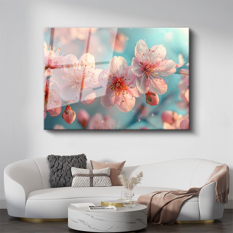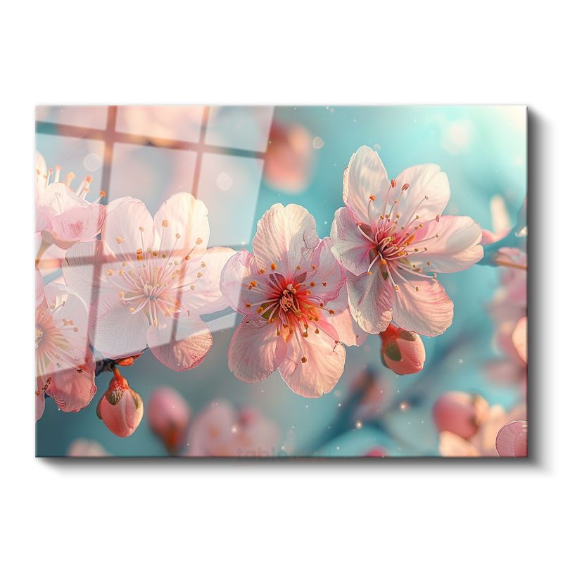 Bahar Çiçekleri - Turkuaz Fonda Pembe Kiraz Dalları Cam Tablo