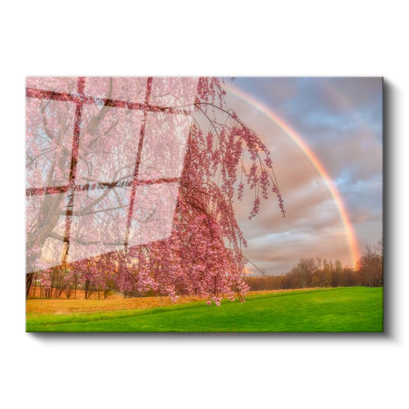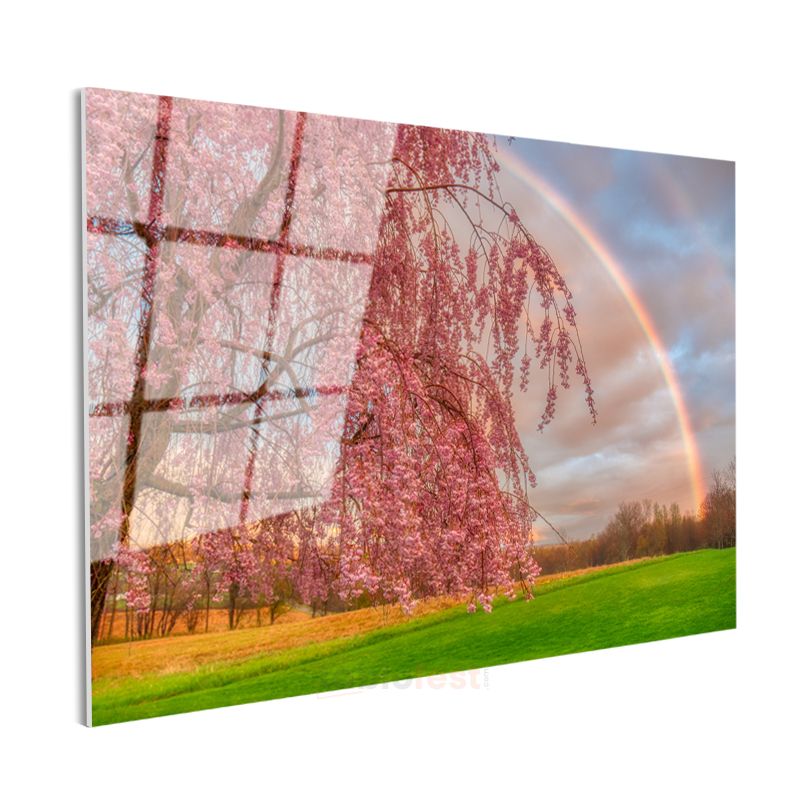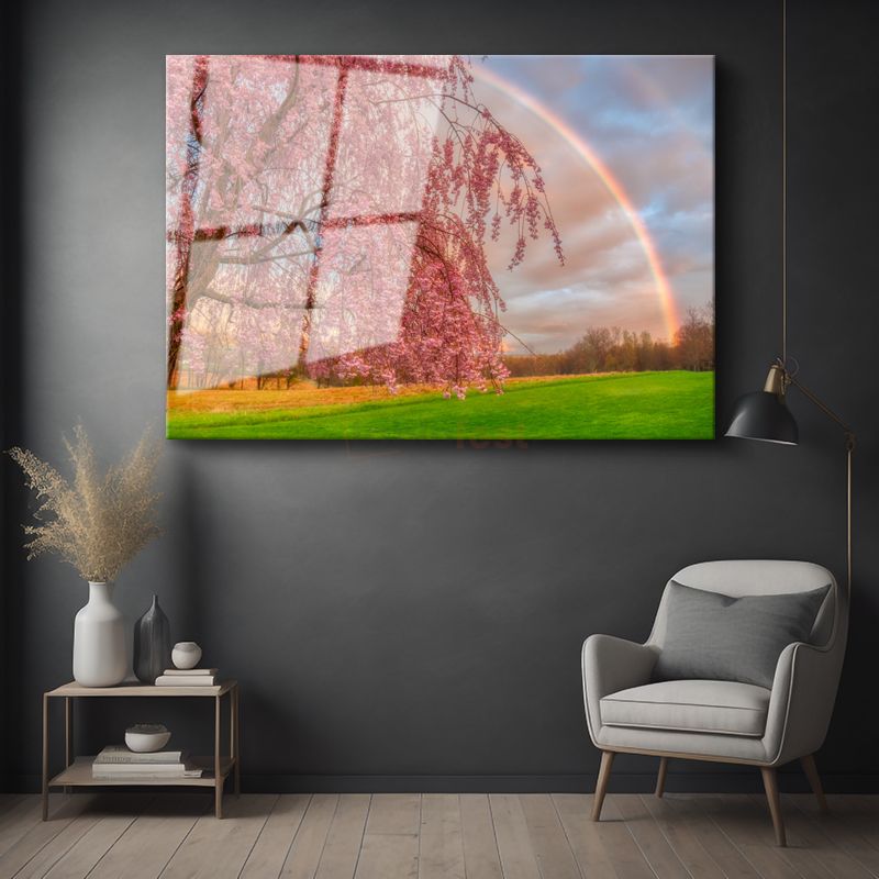 Bahar Gökkuşağı - Pembe Çiçekli Ağaç Manzarası Cam Tablo
