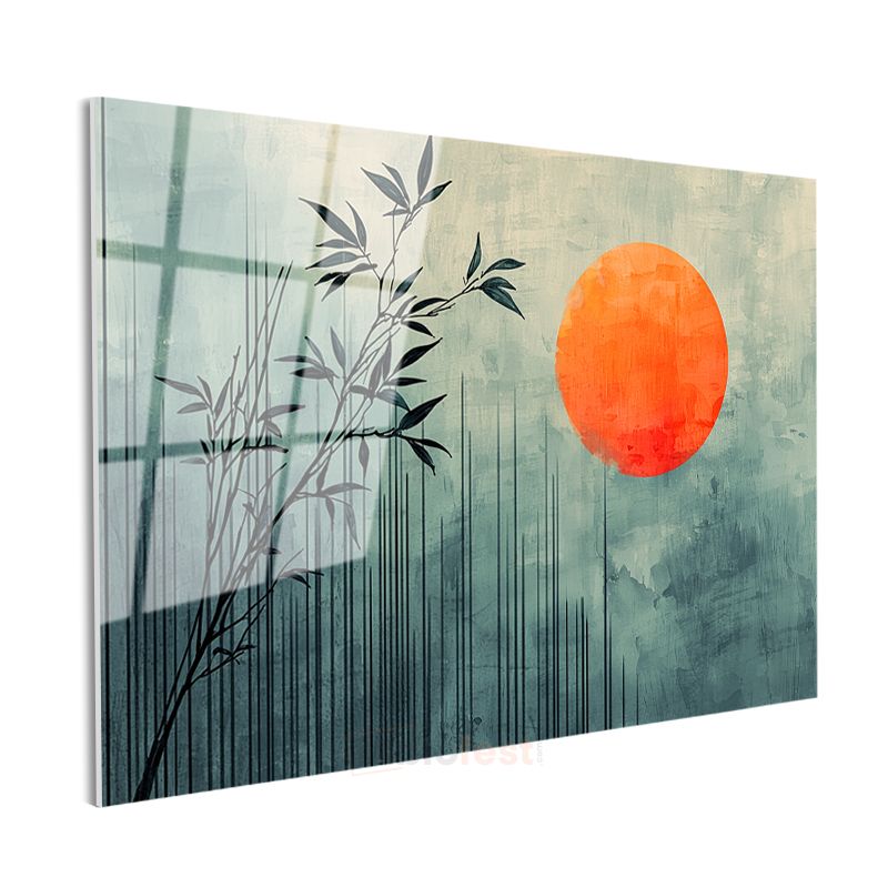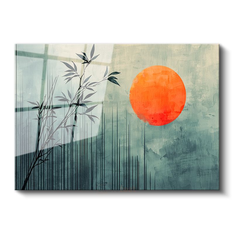Bambu Dalları - Turuncu Güneş Eşliğinde Minimalist Tasarım Cam Tablo