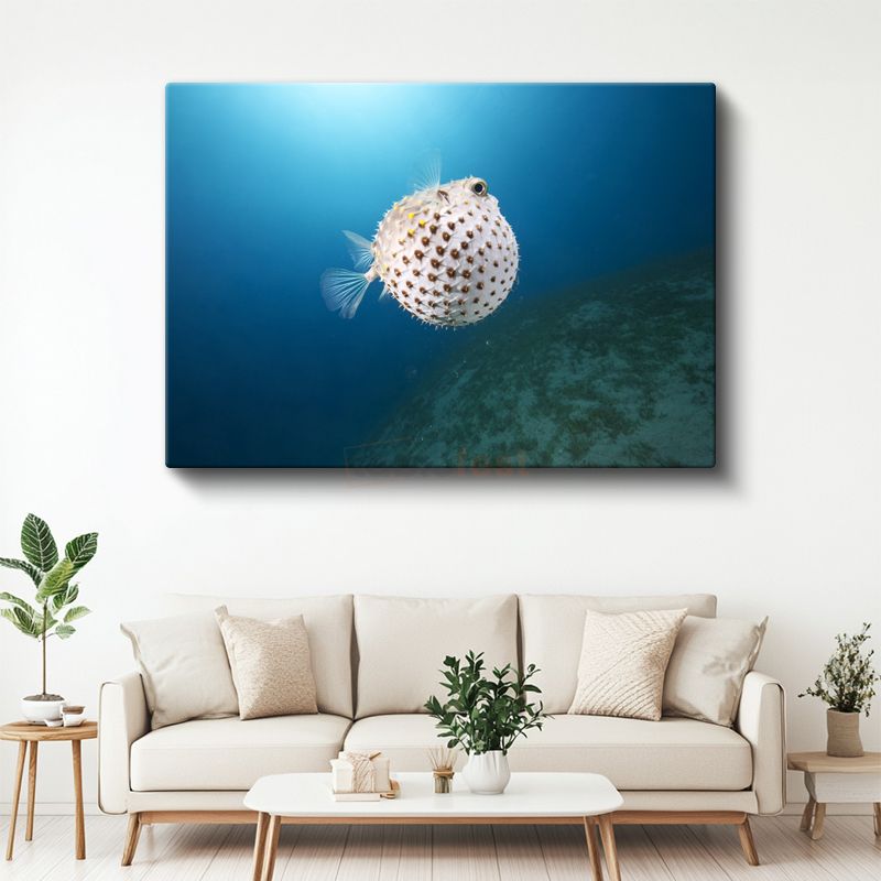 Benekli Balon Balığı - Derin Mavi Suda Yüzen Egzotik Tür Kanvas Tablo