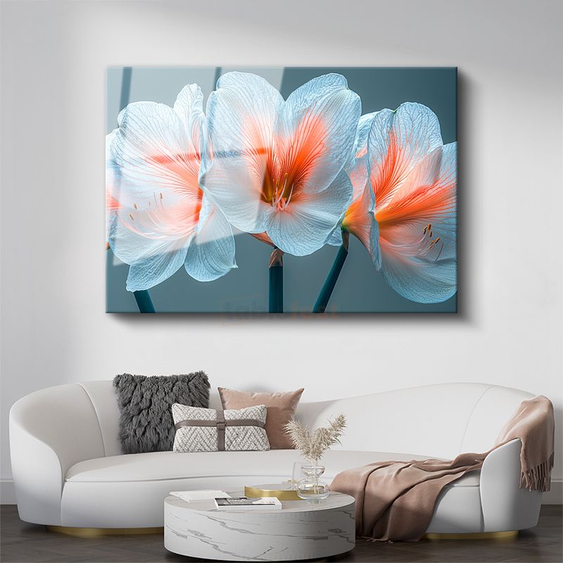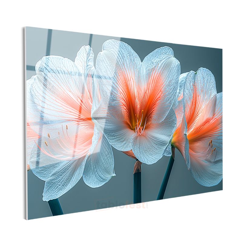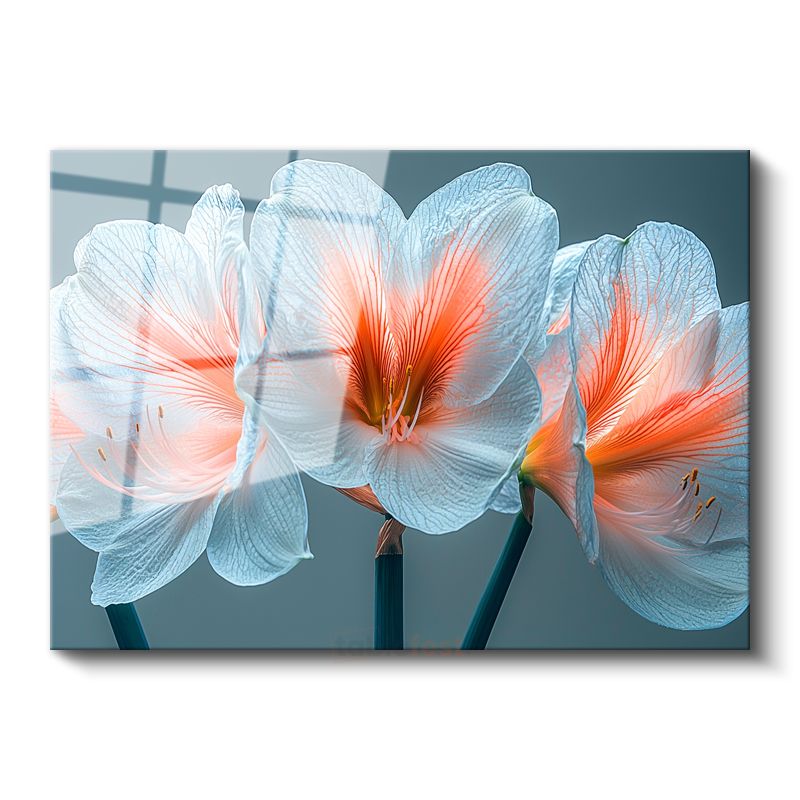 Beyaz Amarilis - Turkuaz Fonda Zarif Çiçek Portresi Cam Tablo