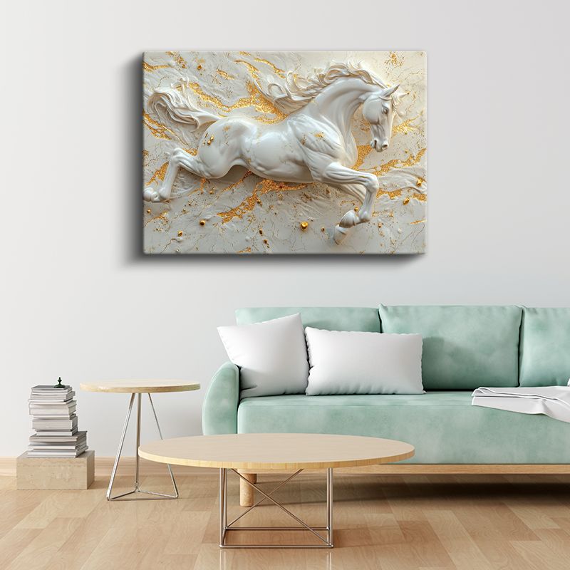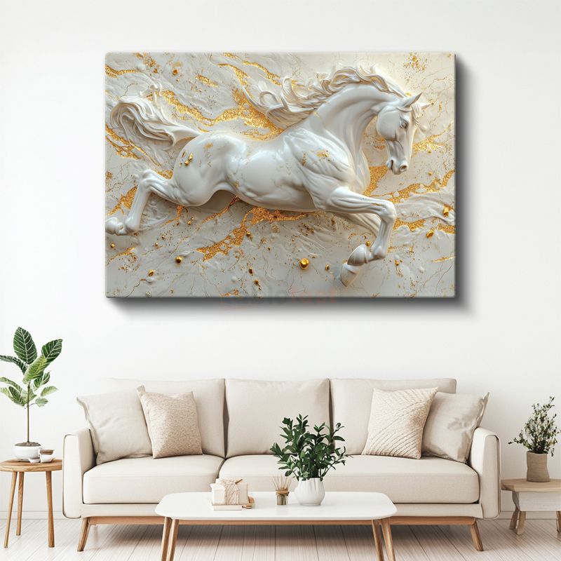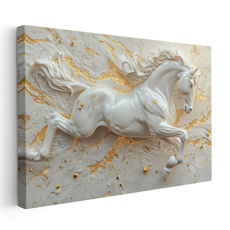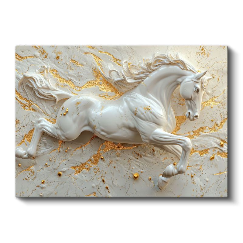 Beyaz At - Kabartma Görünümlü Altın Detaylı Asalet Kanvas Tablo