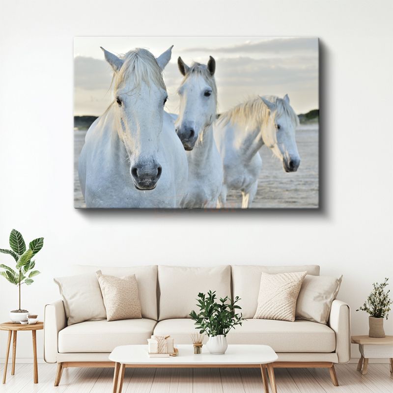 Beyaz Atlar - Sahilde Yan Yana Duran Üçlü Kanvas Tablo
