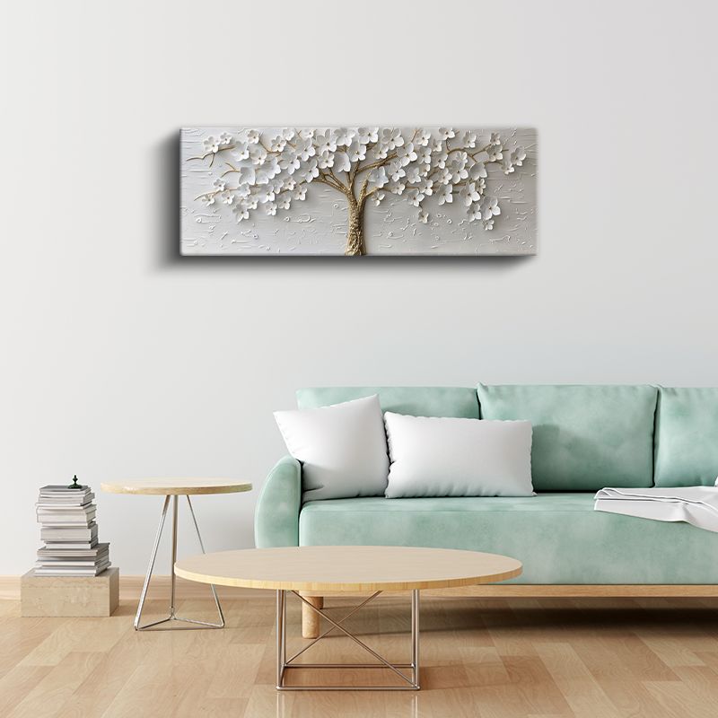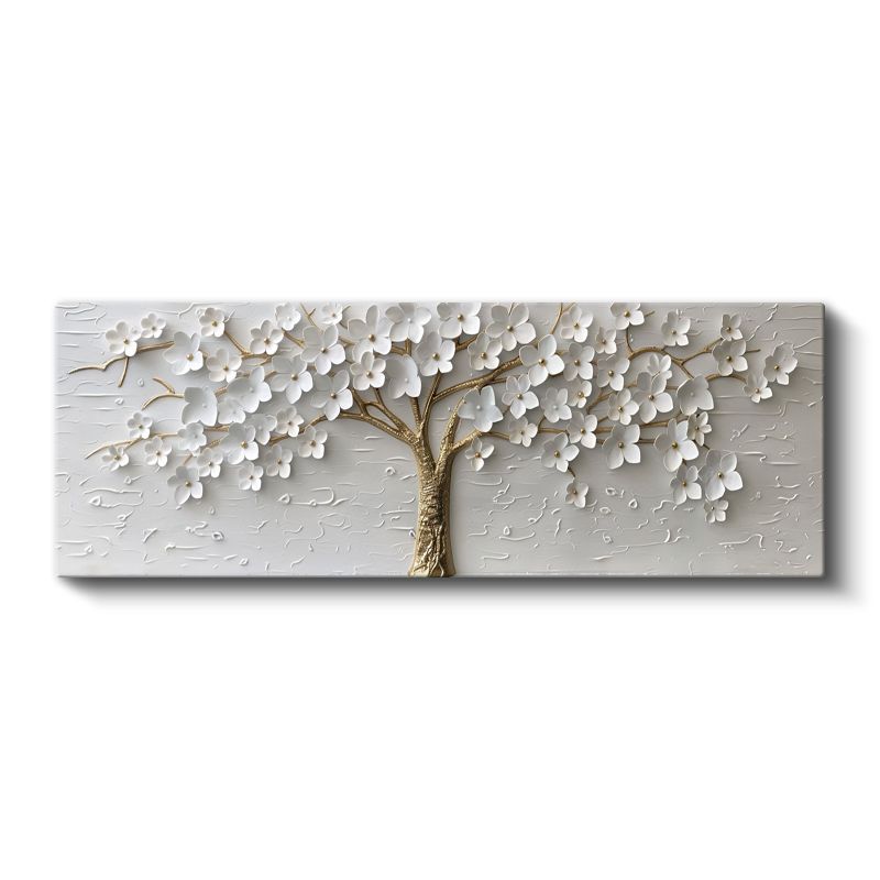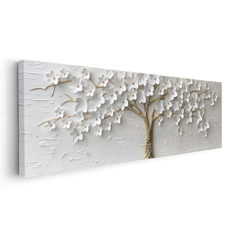 Beyaz Çiçek Ağacı - Dokulu Yüzeyde Altın Detaylı Kanvas Tablo