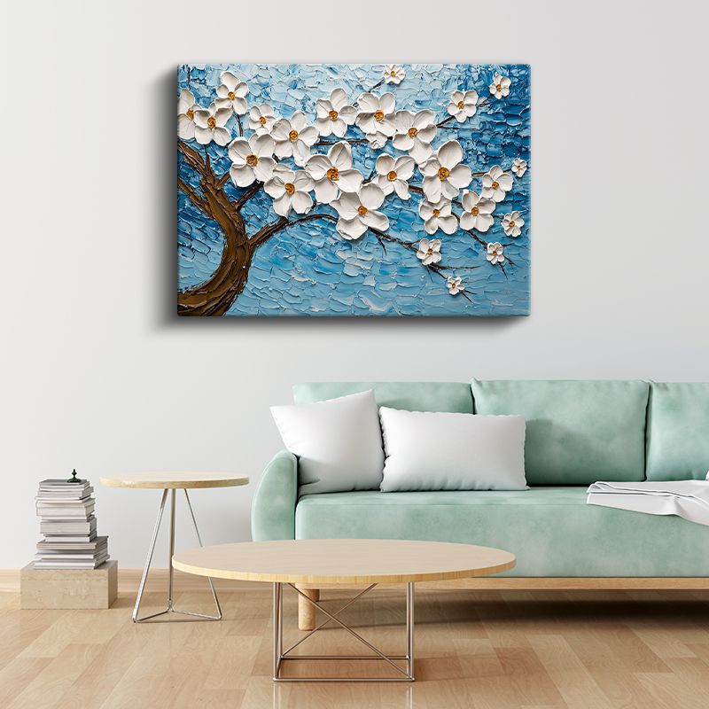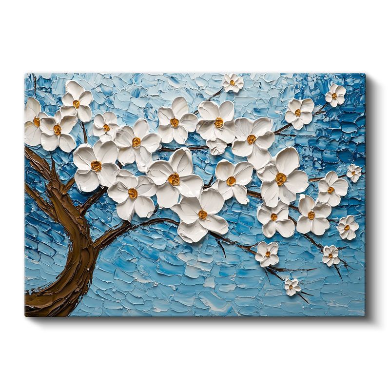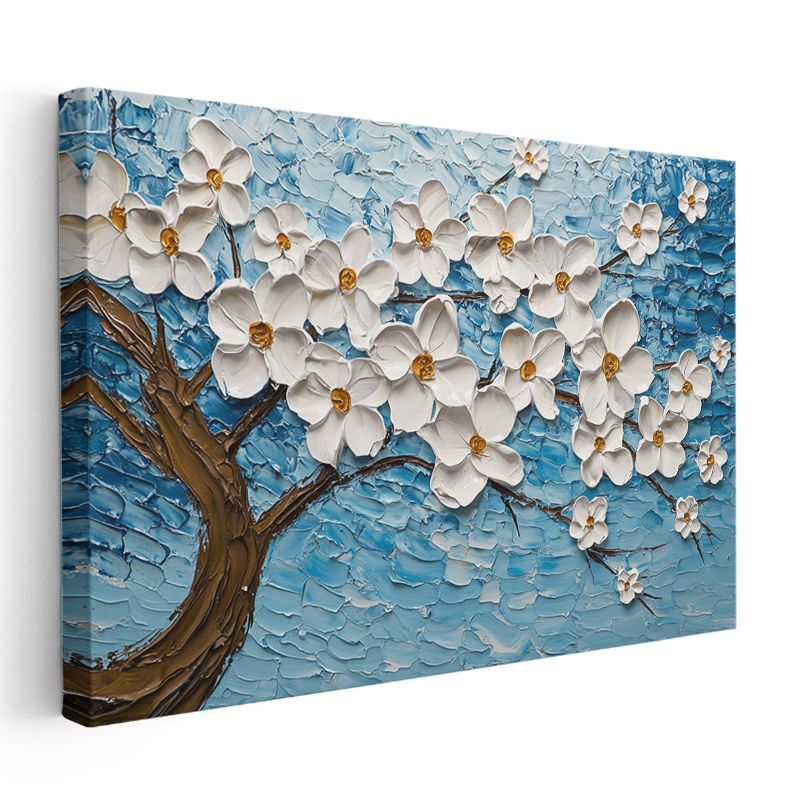 Beyaz Çiçek Ağacı - Mavi Fonda Kabartma Görünümlü Bahar Dalı Kanvas Tablo