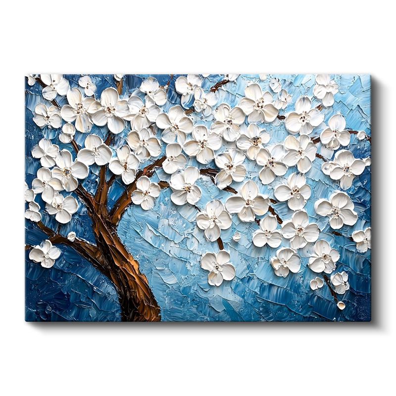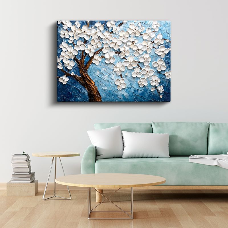 Beyaz Çiçek Ağacı - Mavi Fonda Kabartma Görünümlü Sanat Eseri Kanvas Tablo