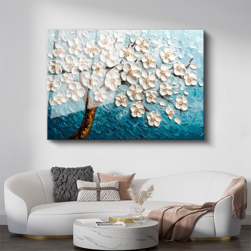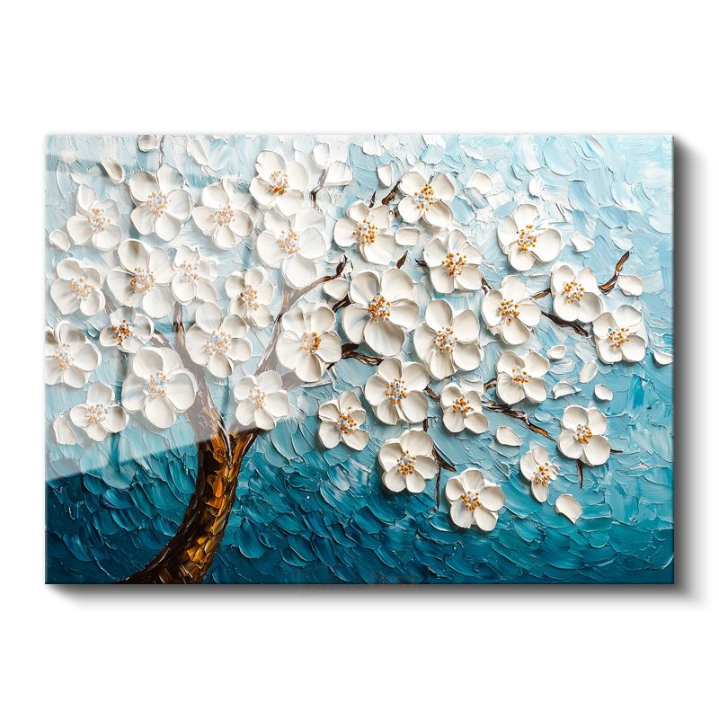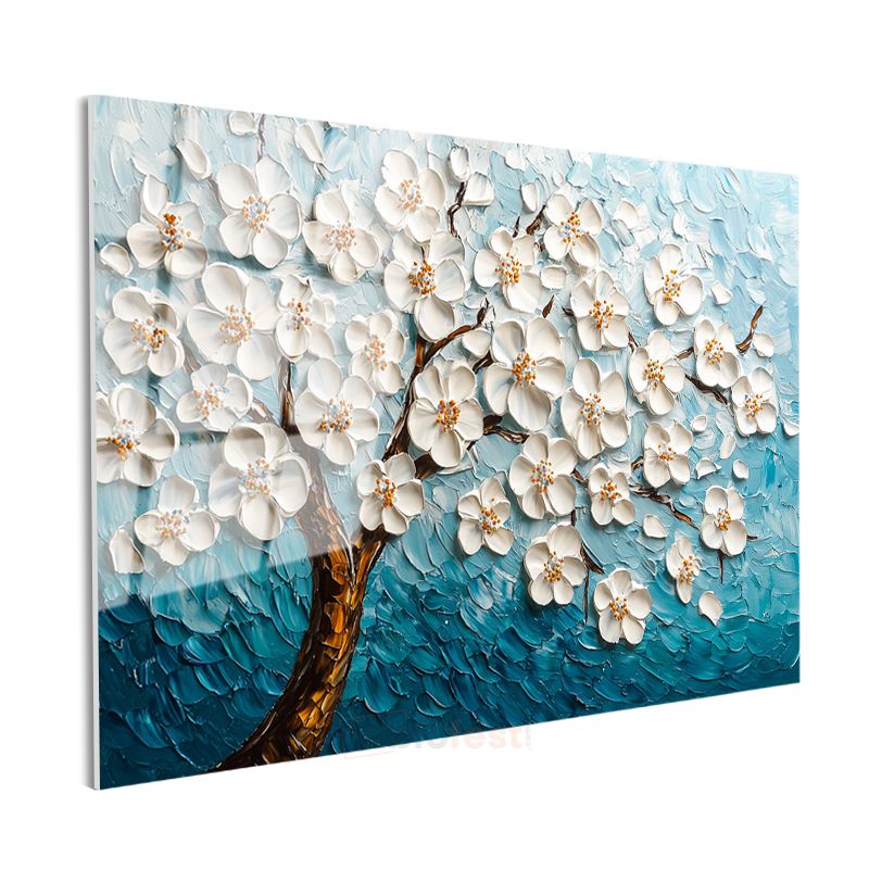 Beyaz Çiçek Ağacı - Mavi Fonda Kabartma Görünümlü Tekstürlü Cam Tablo