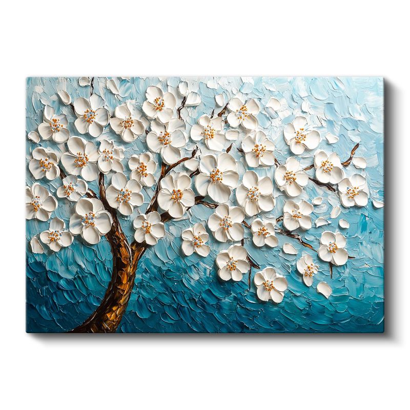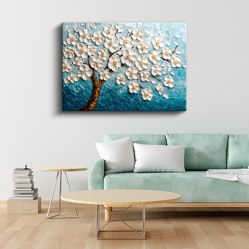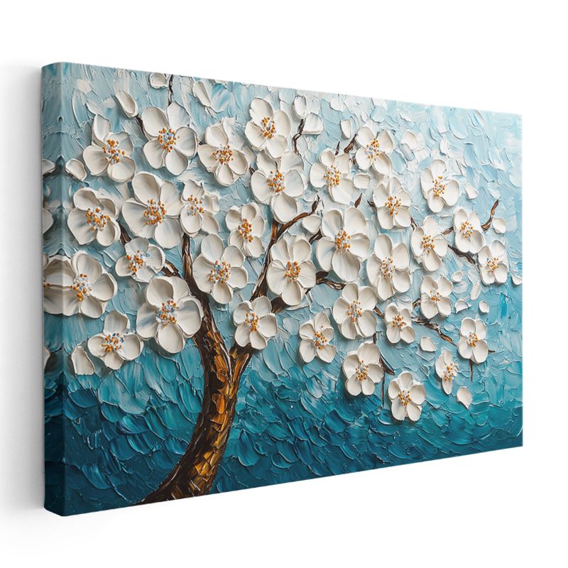 Beyaz Çiçek Ağacı - Mavi Fonda Kabartma Görünümlü Tekstürlü Kanvas Tablo