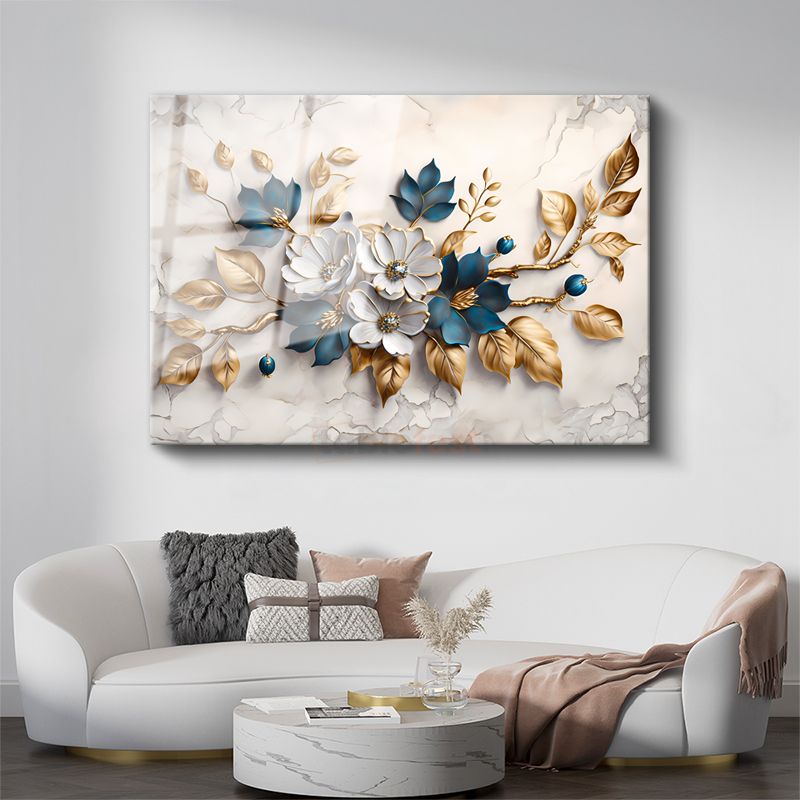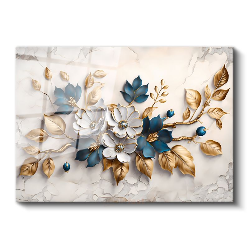 Beyaz Çiçek - Mor Mermer Zeminde Altın Detaylı Tasarım Cam Tablo