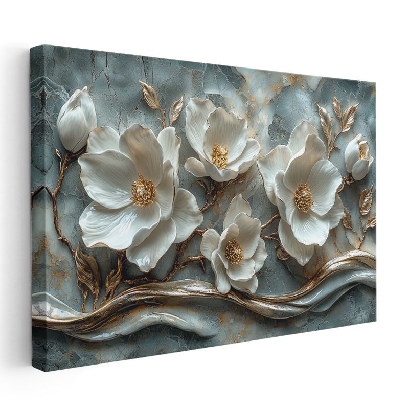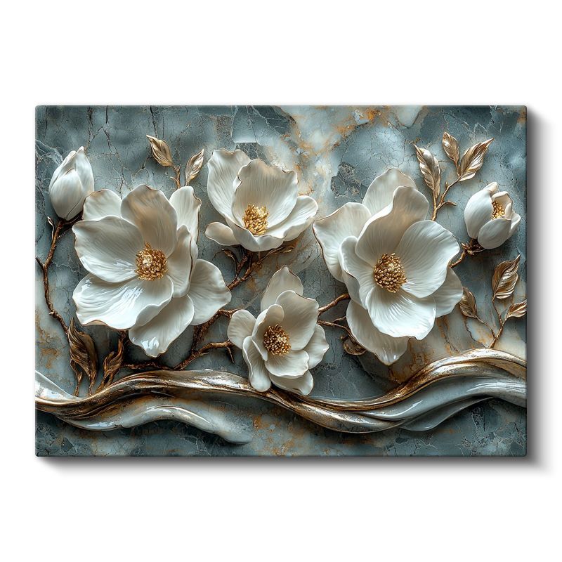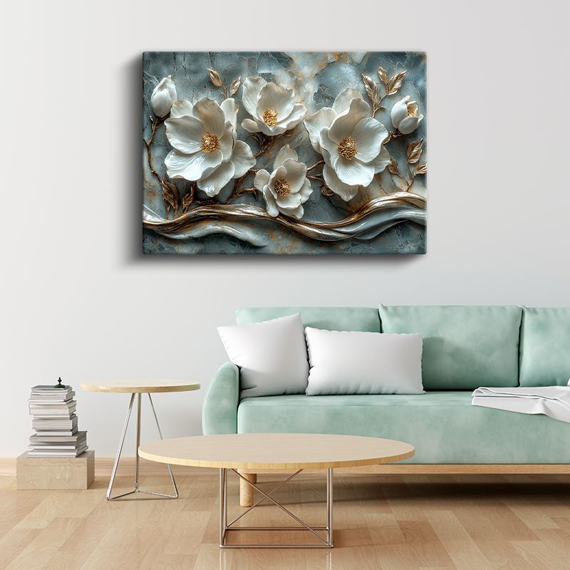 Beyaz Çiçekler - 3D Kabartma Görünümlü Altın Detaylı Kanvas Tablo