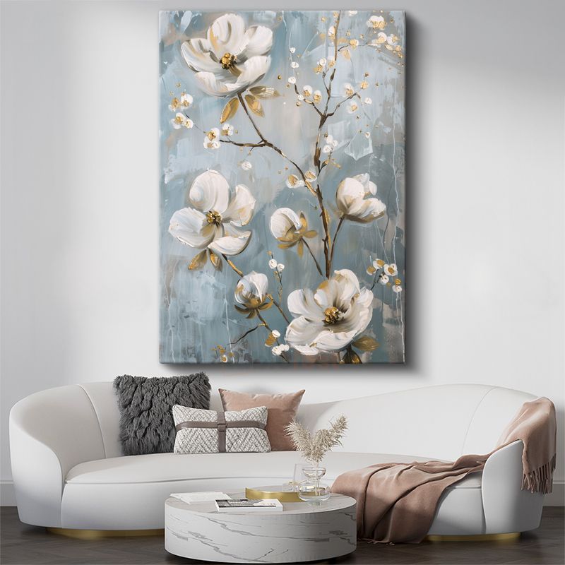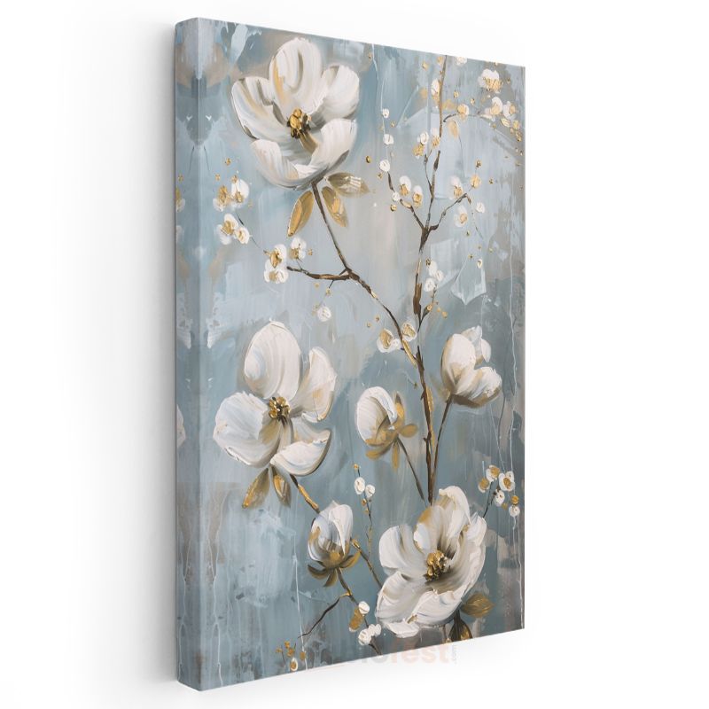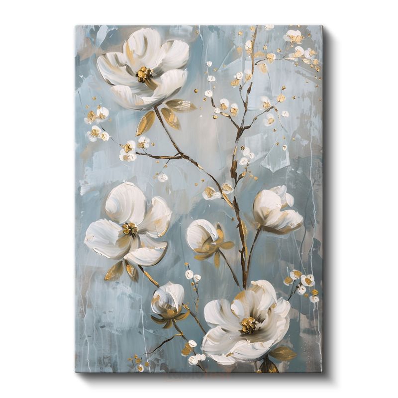 Beyaz Çiçekler - Mavi Fonda Altın Yapraklı Kanvas Tablo