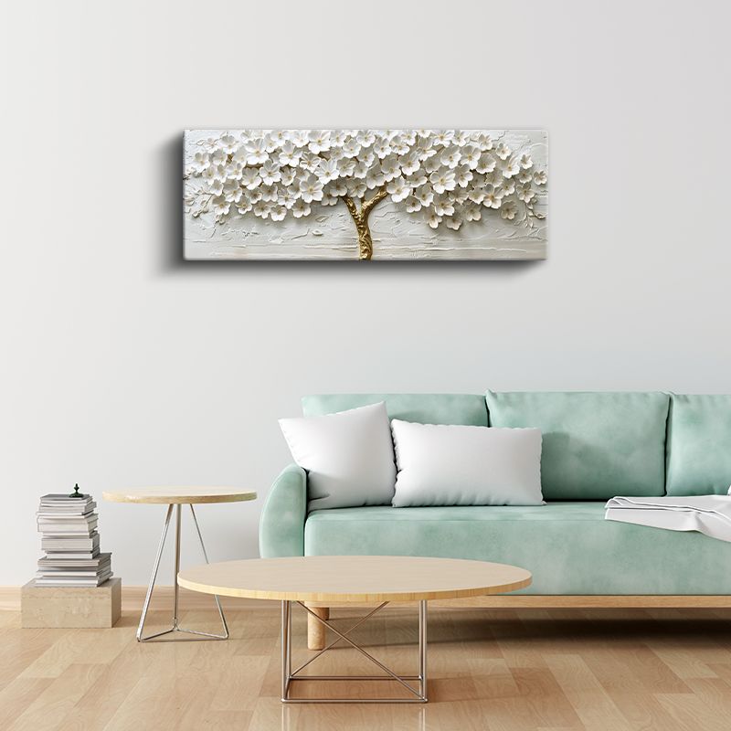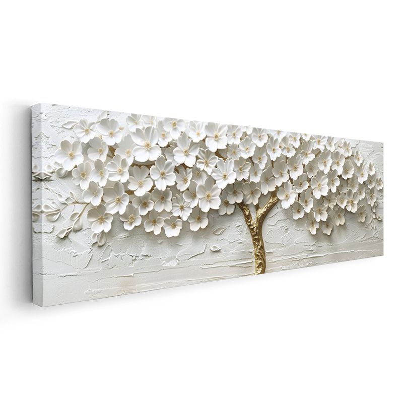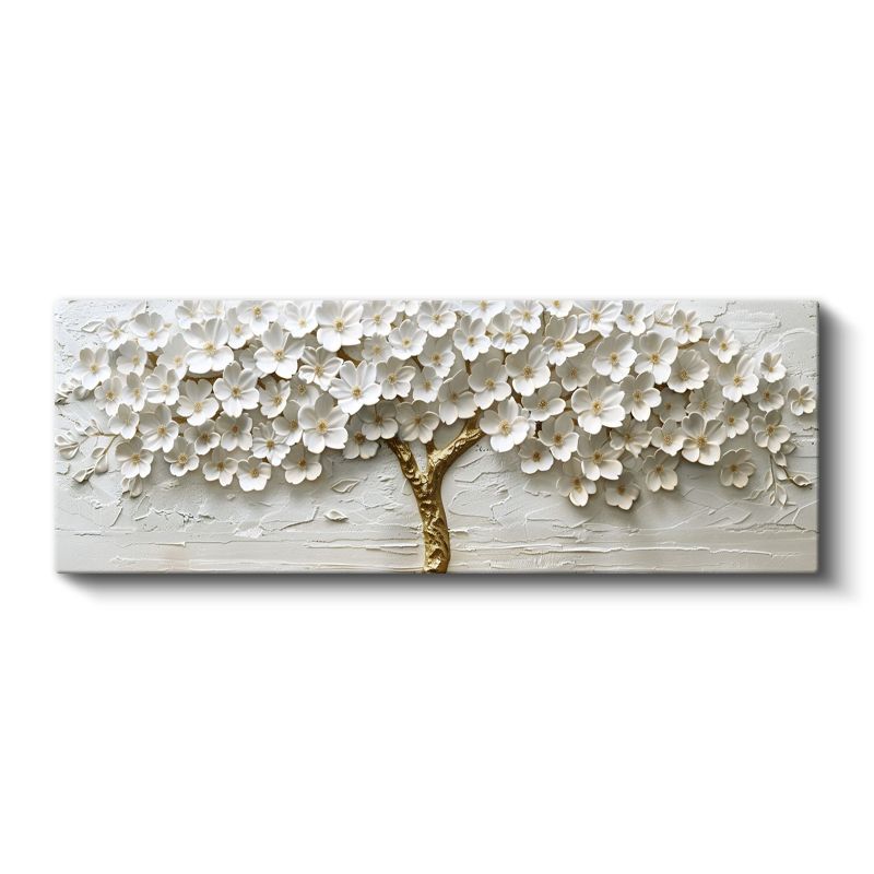 Beyaz Çiçekli Ağaç - Altın Gövdeli 3D Kabartma Görünümlü Tekniği Zarif Tasarım Kanvas Tablo
