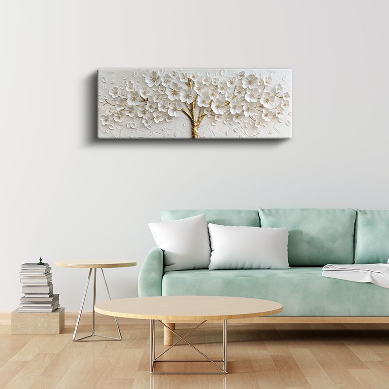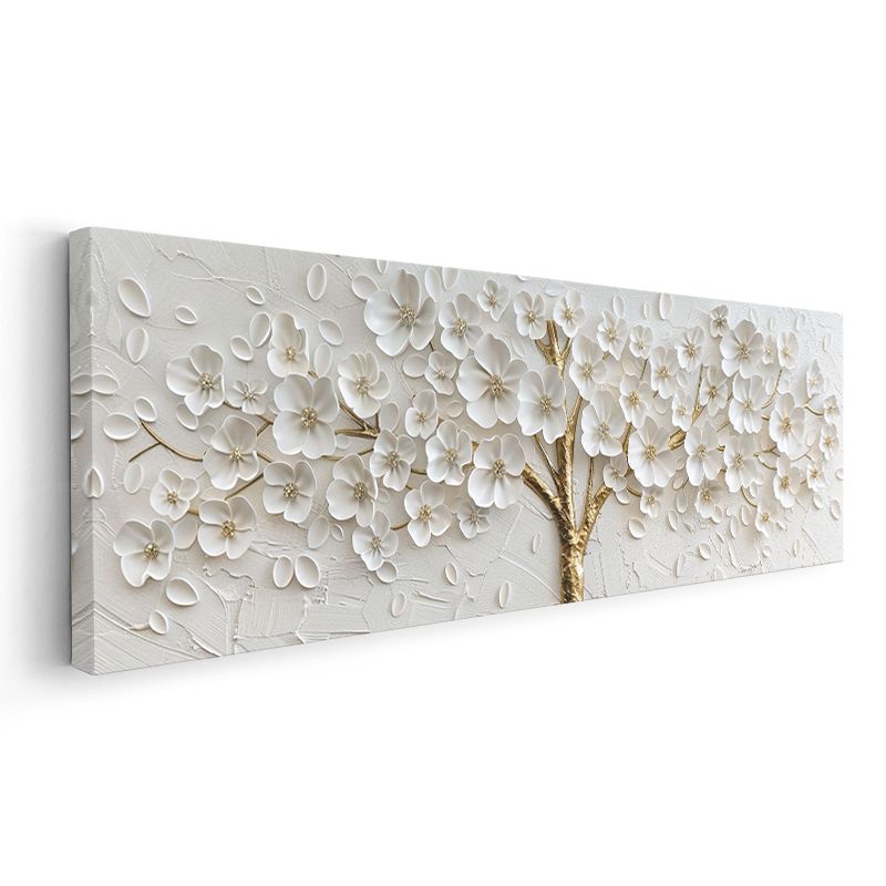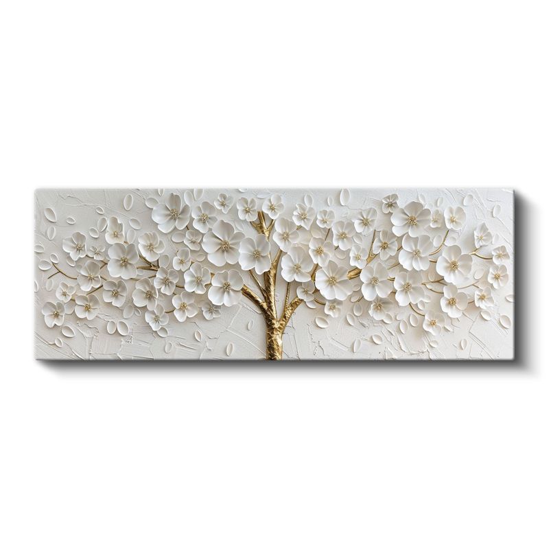 Beyaz Çiçekli Ağaç - Altın Gövdeli 3D Kabartma Görünümlü Zarif Tasarım Kanvas Tablo