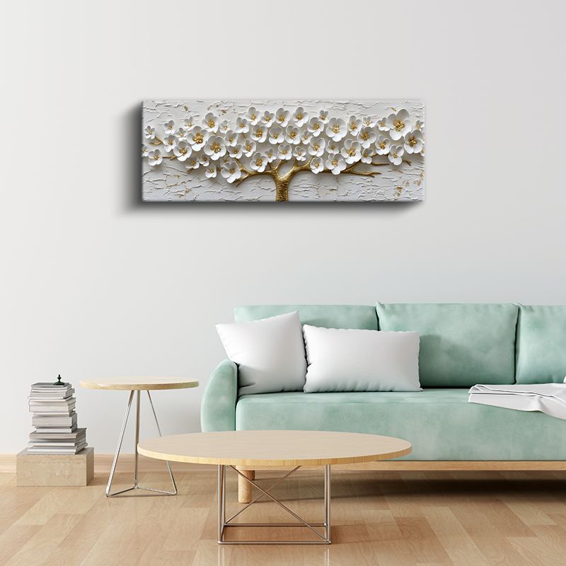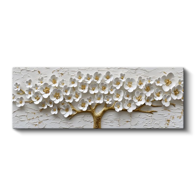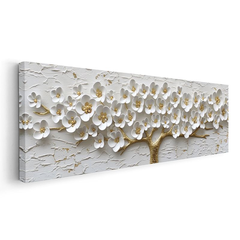 Beyaz Çiçekli Ağaç - Altın Gövdeli 3D Kabartma Görünümlü Zarif Tasarım Kanvas Tablo